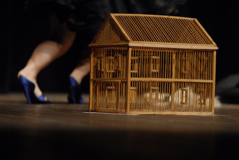 È Valentina Vacca nel primo capitolo Twins con le fattezze di bambina, a segnare il prologo della Rossella capricciosa, inquieta, volubile, perennemente insoddisfatta, che non accetta le sconfitte e non si rassegna, dando inizio, con l’irrompere dei gemelli Tarleton alla demolizione del doppio. In Atlanta, in un paesaggio abitato da sciami di mosche simboli della morte che tutto avvolge, Candida Nieri è Rossella vestita a lutto e impegnata nella festa per raccogliere fondi per le vittime della guerra di Secessione. Scende fra il pubblico per scegliere il suo uomo, portarlo sul palcoscenico e ballare, sognando di voler essere una farfalla. E intanto scorre da una mano all’altra la tazza del thè, oggetto ricorrente come l’emblematica casa, “all’origine di tutte le cose”. Questa, moltiplicata in tanti modellini in miniatura – le abitazioni distrutte dall’incendio durante la guerra del 1861 –, somigliano a gabbie di uccelli, o a case di bambole, che diventeranno sempre più grandi fino a essere, nel finale di Tara, una sola casa (prigione e luogo idilliaco) che ingombra l’intero palcoscenico.