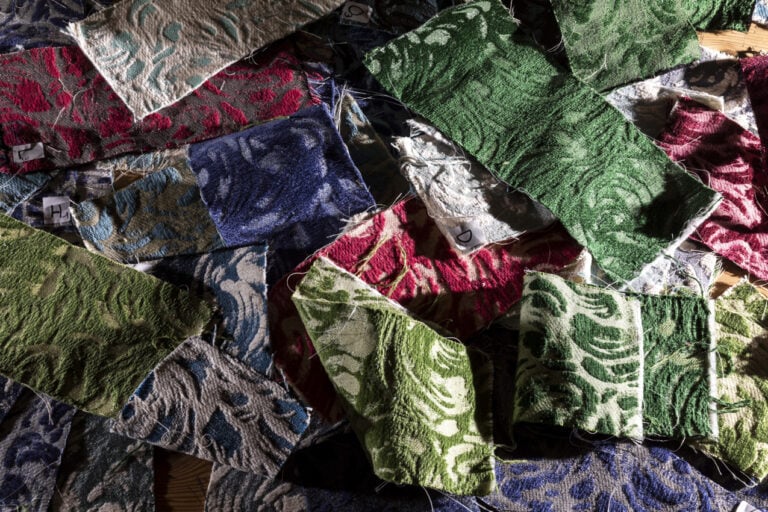 Per l’occasione Daniela Pinotti ha realizzato un esclusivo pattern tessile prodotto da l’Opificio, azienda torinese di tessuti sostenibili, tutti realizzati con fibre naturali e privi di formaldeide. La creazione, un tessuto jacquard chiamato High Tide, sarà presentata in due varianti cromatiche, rosso fragola e verde abete, distinguendosi per la lavorazione raffinata a lampasso, in grado di intrecciare filati multicolore su un fondo essenziale. Adatto a molteplici utilizzi, dal rivestimento di mobili imbottiti alla creazione di tendaggi e cuscini, il tessuto combina artigianalità e innovazione: “Come le stampe e le illustrazioni, il design cattura l’essenza della fluidità e del movimento, interpretati come un viaggio in continua evoluzione. Sono frammenti visivi di un racconto nomade, dove ci si può perdere e ritrovare in un tempo sospeso e indefinito”, commenta Pinotti.