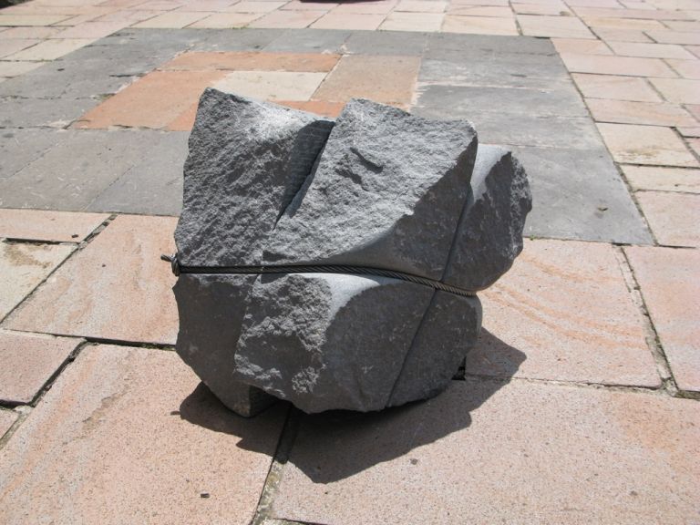 La scrittura connota le opere di Giuseppe Caccavale, che si concentra sul Viaggio in Armenia di Ossip Mandel’stam, ne ricopia i versi – sui muri, in libri d’artista –, se ne appropria per poi restituirli liturgicamente alla natura, alla natura dei luoghi stessi cantati dal poeta. Maria Tsagkari prende spunto da un racconto di Novalis, anch’esso incompiuto come quello di Daumal, che narra della ricerca di un piccolo fiore blu; quegli stessi – su quali basi negarlo – che ora costellano il soffitto a cassettoni della veranda del museo. Mikayel Ohanjanyan si ispira invece all’epopea di Pokr Mher: blocchi di basalto sono tagliati, incisi a mano con un messaggio scritto su di essi, riassemblati e tenuti stretti da cavi d’acciaio. Anche qui, la scrittura è tensione, comunicazione resa incerta e assimilata dopo lunghi sforzi. Diventa scrittura nel senso proprio del termine quando è fatta propria al punto da essere quasi un’invenzione individuale, come d’altronde è l’alfabeto armeno, creato nel 405 dal monaco Mesrop Maštoç.