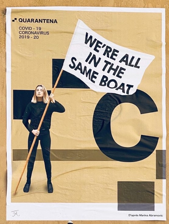 Il riferimento al manifesto della Barcolana è evidente, ma il motto ora è più che mai attuale. Il lavoro, oltre a rendere omaggio alla grande artista Abramović, si arricchisce di ulteriori significati: il simbolo sullo sfondo corrisponde infatti alla Lettera L del Codice Internazionale dei Segnali Marittimi, denominato “Lima”. Questo, quando esibito in porto, significa “La nave è sotto quarantena”. Attraverso il messaggio “We’re all in the same boat” si vuole quindi dichiarare la necessità di una presa di coscienza di un problema comune, il quale ci pone tutti su uno stesso piano, (si è soliti dire “siamo tutti sulla stessa barca”).