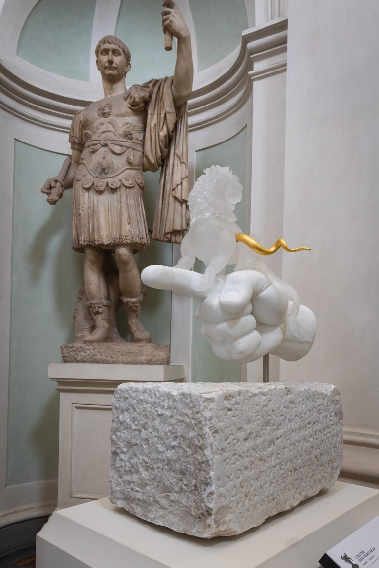 Affronta con audacia i maestri dell’arte italiana e fiamminga esposti alla Galleria degli Uffizi Koen Vanmechelen, l’artista belga scelto dall’istituzione diretta da Eike Schmidt per aprire la stagione espositiva 2022. Per la personale Seduzione l’eclettico autore, classe 1965, ha concepito trenta opere collocate lungo l’intero percorso museale, anche a fianco dei capolavori. Non un azzardo o una provocazione, come una lettura affrettata potrebbe forse suggerire. La prospettiva concettuale delineata in mostra dal pittore, scultore e performer ricalca infatti i medesimi archetipi dell’antichità greco-romana, mutuati in seconda battuta dal Rinascimento, e riconosce come proprie radici teoriche le consolidate polarità “vita-morte”, “umano-divino”, “terreno-spirituale”, “naturale-artificiale” da sempre presenti nell’arte globale. Il risultato sono opere figurative dall’esecuzione impeccabile, in cui marmo, acciaio e bronzo si combinano ripetutamente con la trasparenza e la vulnerabilità del vetro, materiale per eccellenza “duplice”. Accoglie sì il passaggio della luce e si lascia attraversare dallo sguardo, ma è anche capace di ferire, perdendo a sua volta forma e funzioni assegnate.