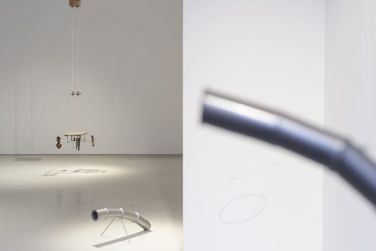 Entrando nei locali di Tempesta Gallery a Milano siamo accolti da un fleximofono, definito anche Scultura sonante, che presenta delle molle in acciaio armonico fissate a una lamiera appesa al soffitto: una volta messe in movimento, emettono un suono simile al rumore del vento. Possiamo poi vedere una Macchina che respira, composta da una biella che muove un cilindro, creando aria che viene incanalata in due tubi e dando così l’illusione di una macchina viva. Incontriamo anche un Campo autonomo, ovvero una macchina pensata dall’artista come una specie di torre di controllo che nella Città Fantastica, grazie alla sua capacità di programmarsi sempre in maniera diversa, azionava in modo casuale tutte le altre macchine.