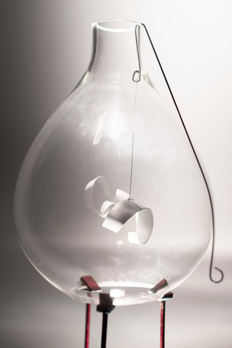 Troviamo poi anche un Rilevatore cromocinetico, dove un proiettore di luce sintetica illumina una corda che, oscillando, crea tutti i colori dello spettro luminoso. Prisma meccanico è simile, ma al posto della corda c’è un disco che, roteando, scompone il fascio di luce.