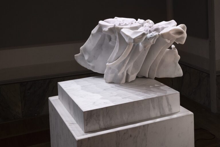 Quando ho ricevuto la disponibilità di quelle sale mi sono posto degli interrogativi. Si trattava di uno spazio apparentemente semplice in realtà con una serie di stratificazioni già delineate. Ma nel momento in cui ho collocato nella stanza il primo pezzo, quello scolpito nel marmo bianco con il plinto verde fluo, mi sono reso conto che la dimensione dello spazio che diveniva così “espositivo” era perfetta e la scultura restituiva lo spazio in una nuova funzione.