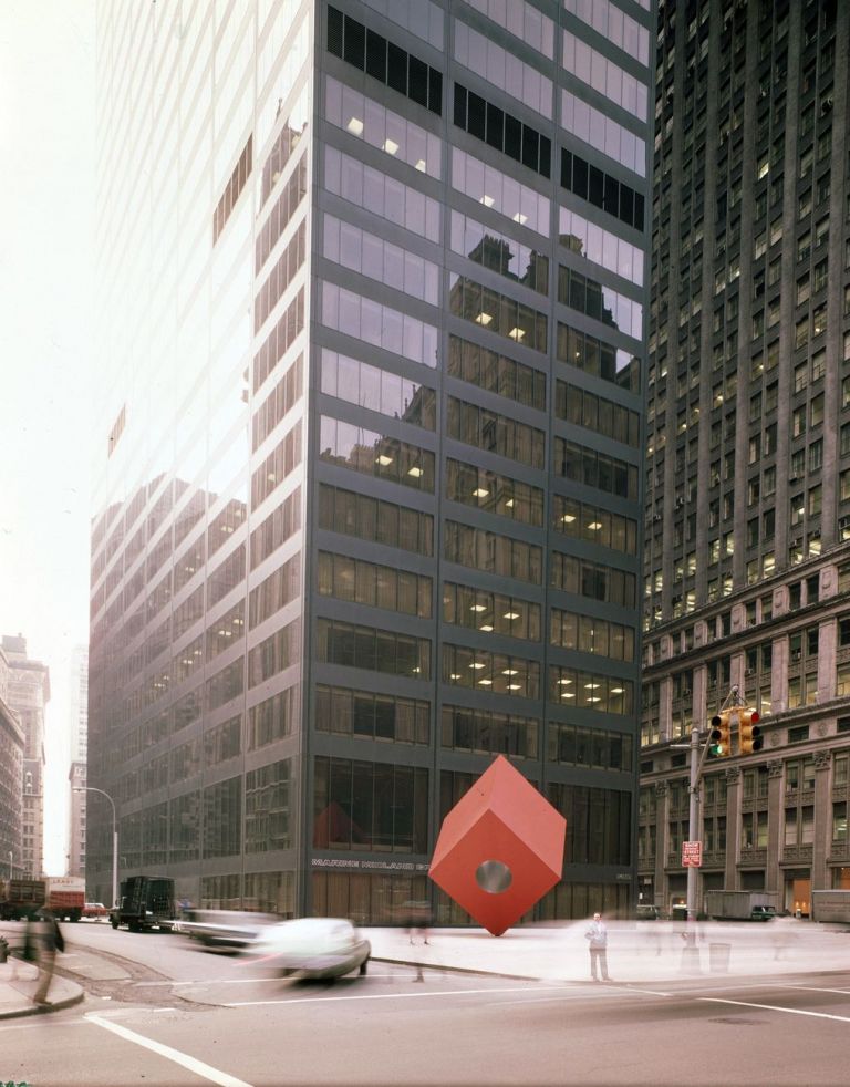 Diamo per assodato che abbiate già fatto la classica camminata a Battery Park, dove avrete incontrato opere di Tom Otterness (The Real World, 1992) [1], Ned Smyth (The Upper Room, 1987) [2] e Louise Bourgeois (Eyes, 1995) [3], e liquidato l’immancabile foto con toccatina portafortuna ai testicoli del Charging Bull (1989) di Arturo Di Modica [4]. Dopo la tappa d’obbligo a Trinity Church, proseguendo verso nord su Broadway, arriverete a Zuccotti Park, che nell’autunno 2011 fu trasformata in accampamento e centro operativo di Occupy Wall Street. Ai bordi del giardino trovate Joie de Vivre (1998) di Mark di Suvero [5]: venti metri di acciaio rosso che evocano il Costruttivismo russo, in forte contrasto con un quartiere che è il cuore della finanza americana. Dall’altro lato della strada, un’altra nota di rosso: è il Red Cube (1968) di Isamu Noguchi [6]. Appoggiato su un angolo e proiettato verso il cielo, il cubo sembra opporsi alle scure superfici dei grattacieli circostanti e allo stesso tempo, attraverso un foro centrale cilindrico, si apre verso le architetture che lo circondano.