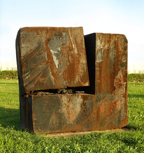 Spagnulo è però uomo del Sud, il rapporto atavico con la storia e la terra gli richiede lo sforzo di operare un corpo a corpo serrato con l’opera, e il fuoco diviene il punto di connessione tra la sua mente e il blocco di materia da plasmare. Le opere della fine degli Anni Sessanta iniziano a riguardare il fare intrinseco della scultura stessa, recuperando la geometria e la logica costruttiva della materia con cui sono forgiate. Gli studi dell’artista sono gli altiforni, le officine, le acciaierie. Il ferro, al pari della ceramica della sua terra, non è però un elemento immobile, ma una struttura mentale e fisica da modificare e alterare. È il caso dei tre imponenti lavori in corten in mostra alla Biennale di Venezia del 1972.