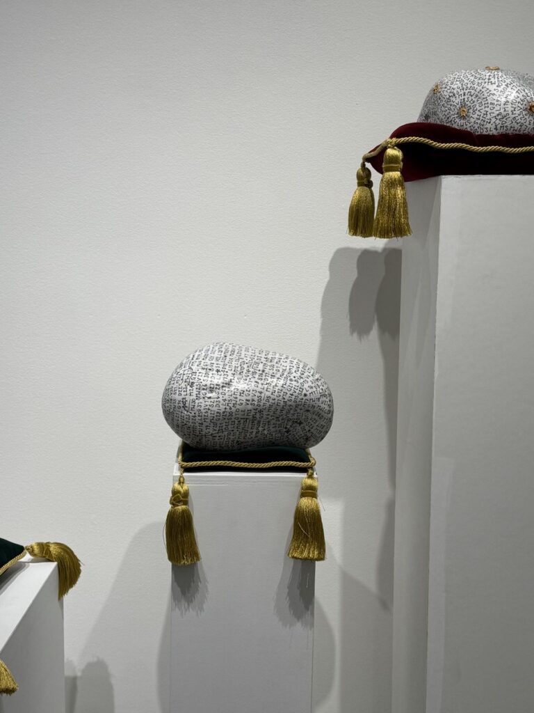 Il concept della mostra ruota attorno all'idea di ritmo e modulo che si differenziano unicamente per essere o non essere installabili su un corpo. Il corpo diviene un edificio sacro, un tempio fatto di colonne, finestre e oculi, dove ogni elemento ne definisce la forma e il significato, non come una protesi, ma come un sigillo che ne segna l’identità. Sassi di marmo levigato e lavorato con inserti di oro e Ventagli di acciaio cucito con il filo rosso punteggiati da pietre riportanti l’iconico “calendario”, rimandano ad una coerenza interna alla ricerca di Cariello che fa di questa mostra il contrario di una divagazione o di un’evasione dal solco del suo pensiero.