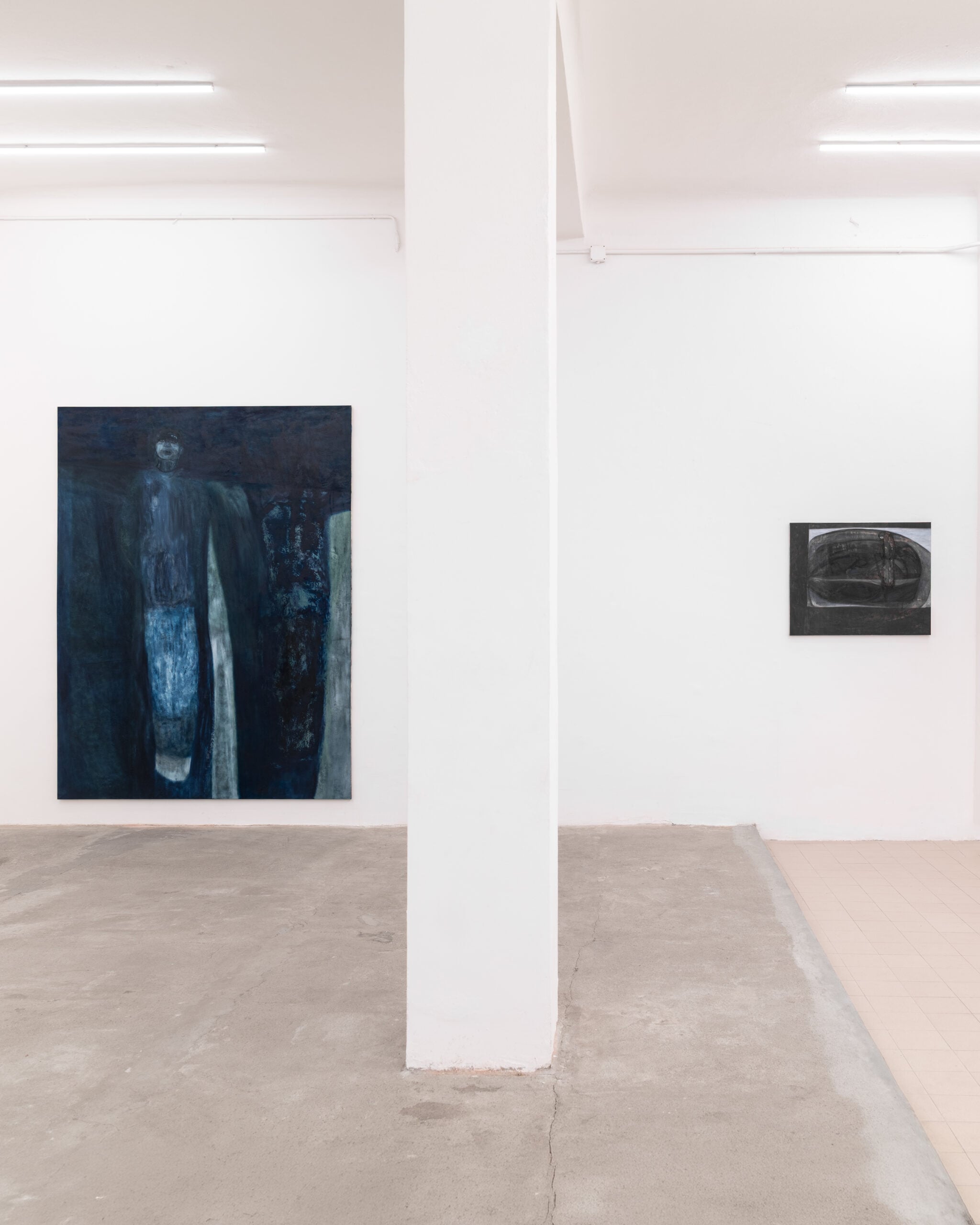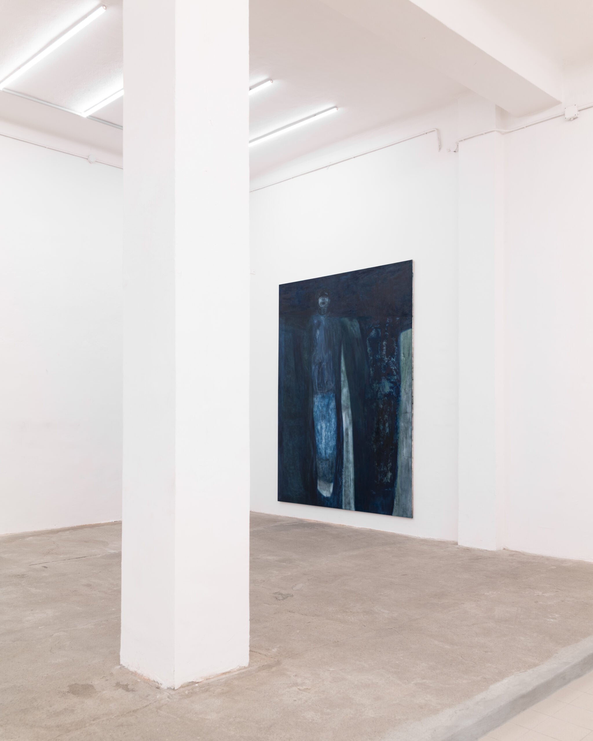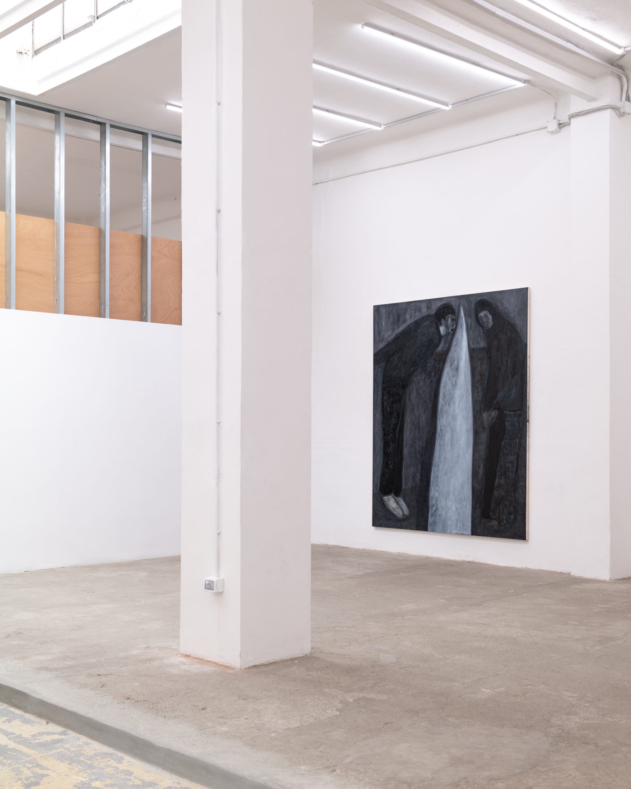 Nei suoi dipinti lo spazio è strettamente legato al formato delle tele, al modo in cui i soggetti vengono raffigurati e alla grande dimensione che questi hanno in proporzione allo sfondo. Il suo lavoro è immaginato come sull’orlo del collasso e la monumentalità costituisce una pratica di esposizione del limite, dove la forma si costituisce per la sua capacità di sostenere l’instabilità dello spazio che la contiene. “Non c’è orizzonte a cui tendere, non c’è fondo su cui poggiare. In questo spazio non esistono coordinate, ma una promessa di equilibrio sospesa in un campo di forze compresse. Abitarlo, significa farsi carico di tutto il loro peso per poterne emergere. Solo ciò che è in grado di resistere, può sopravvivere”, scrive Margherita Arduini, autrice del testo critico. “Rinunciare a punti di controllo; lasciare che prima il gesto, e poi lo sguardo, non abbiano appigli, né spazi sicuri”.