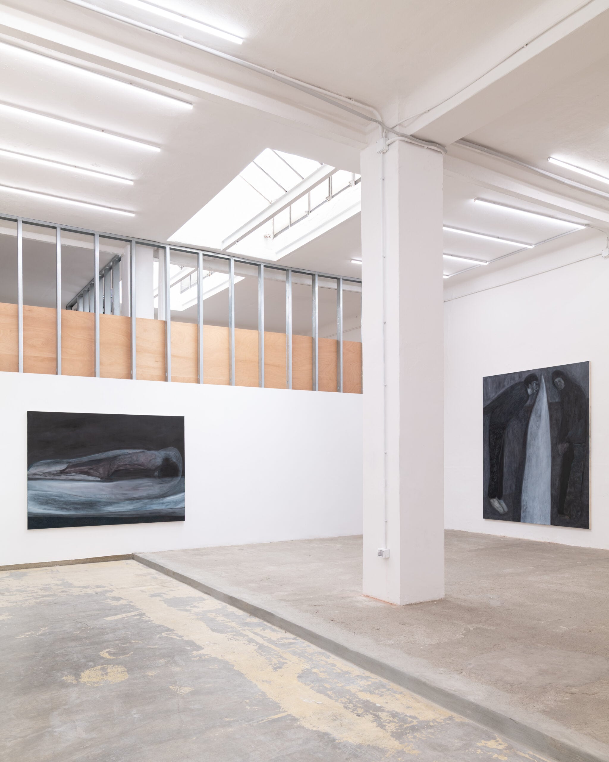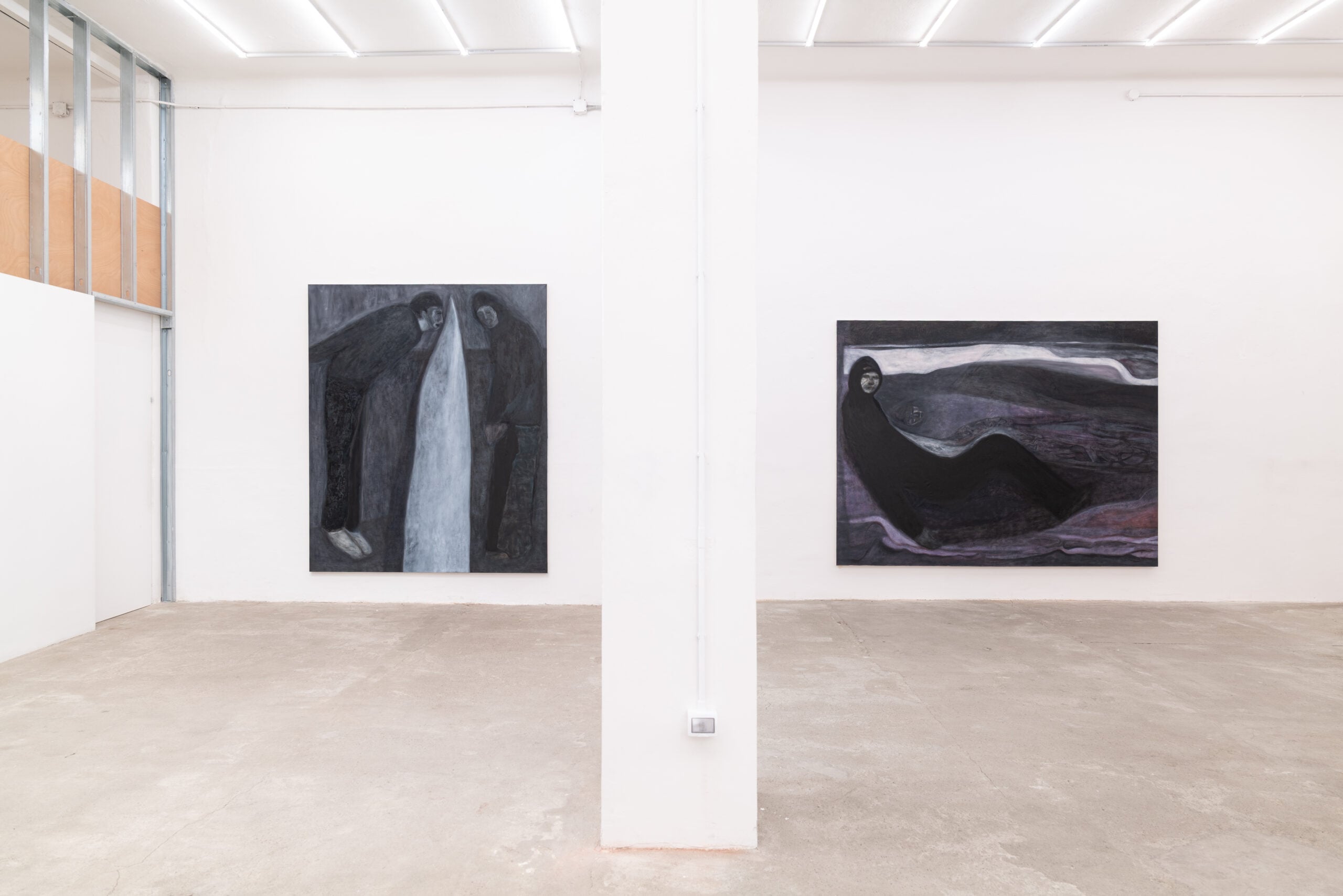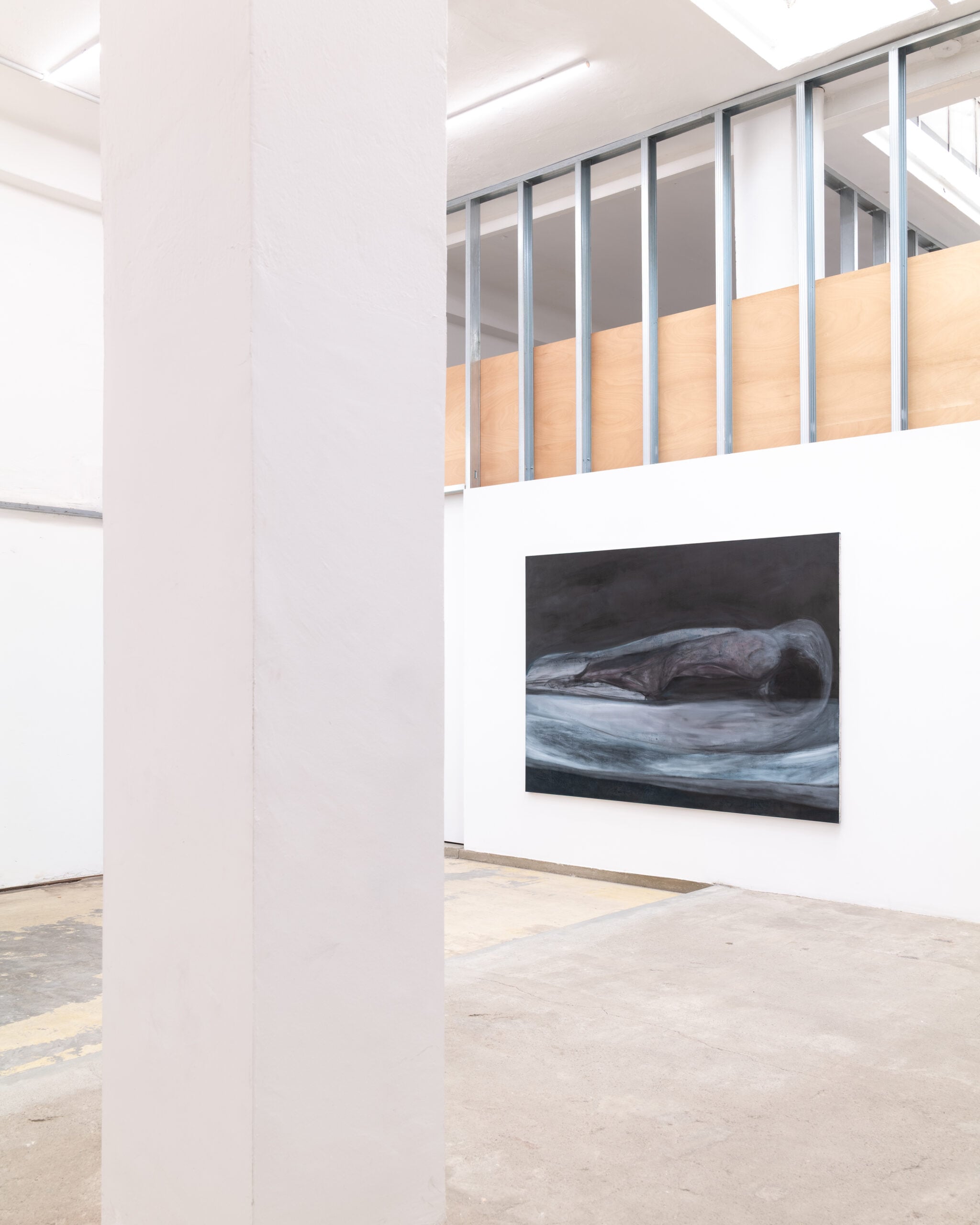 Nei suoi dipinti lo spazio è strettamente legato al formato delle tele, al modo in cui i soggetti vengono raffigurati e alla grande dimensione che questi hanno in proporzione allo sfondo. Il suo lavoro è immaginato come sull’orlo del collasso e la monumentalità costituisce una pratica di esposizione del limite, dove la forma si costituisce per la sua capacità di sostenere l’instabilità dello spazio che la contiene. “Non c’è orizzonte a cui tendere, non c’è fondo su cui poggiare. In questo spazio non esistono coordinate, ma una promessa di equilibrio sospesa in un campo di forze compresse. Abitarlo, significa farsi carico di tutto il loro peso per poterne emergere. Solo ciò che è in grado di resistere, può sopravvivere”, scrive Margherita Arduini, autrice del testo critico. “Rinunciare a punti di controllo; lasciare che prima il gesto, e poi lo sguardo, non abbiano appigli, né spazi sicuri”.