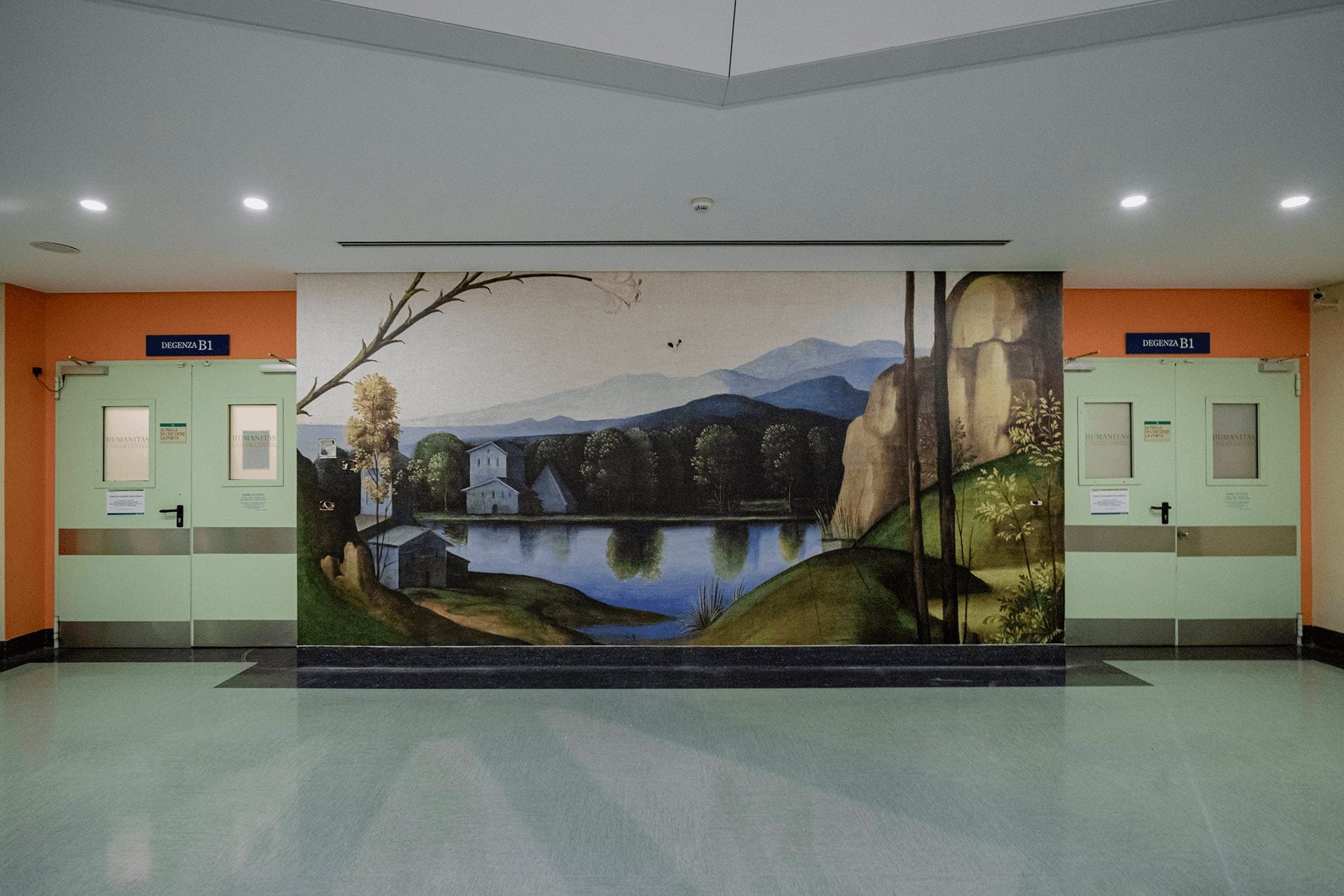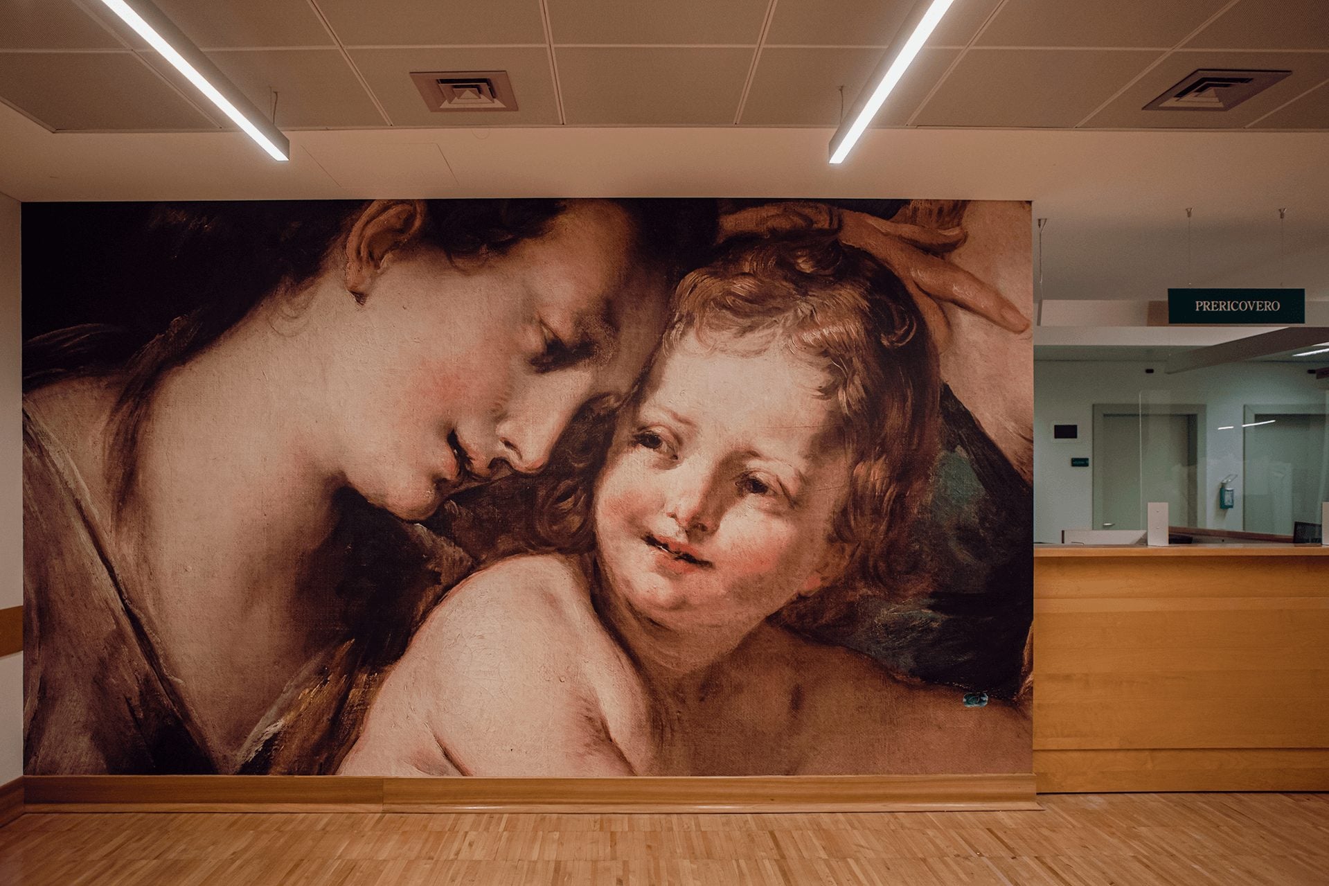 A Milano, l’Istituto Clinico Humanitas ha reso strutturale il dialogo con il sistema museale cittadino. Il progetto Brera in Humanitas, sviluppato con la Pinacoteca di Brera, porta negli spazi clinici riproduzioni in altissima definizione e in scala monumentale di dettagli pittorici: mani, volti, panneggi isolati e ingranditi fino a diventare paesaggi visivi. L’effetto non è quello della copia, ma della dilatazione percettiva. L’opera, decontestualizzata e amplificata, diventa campo di immersione.