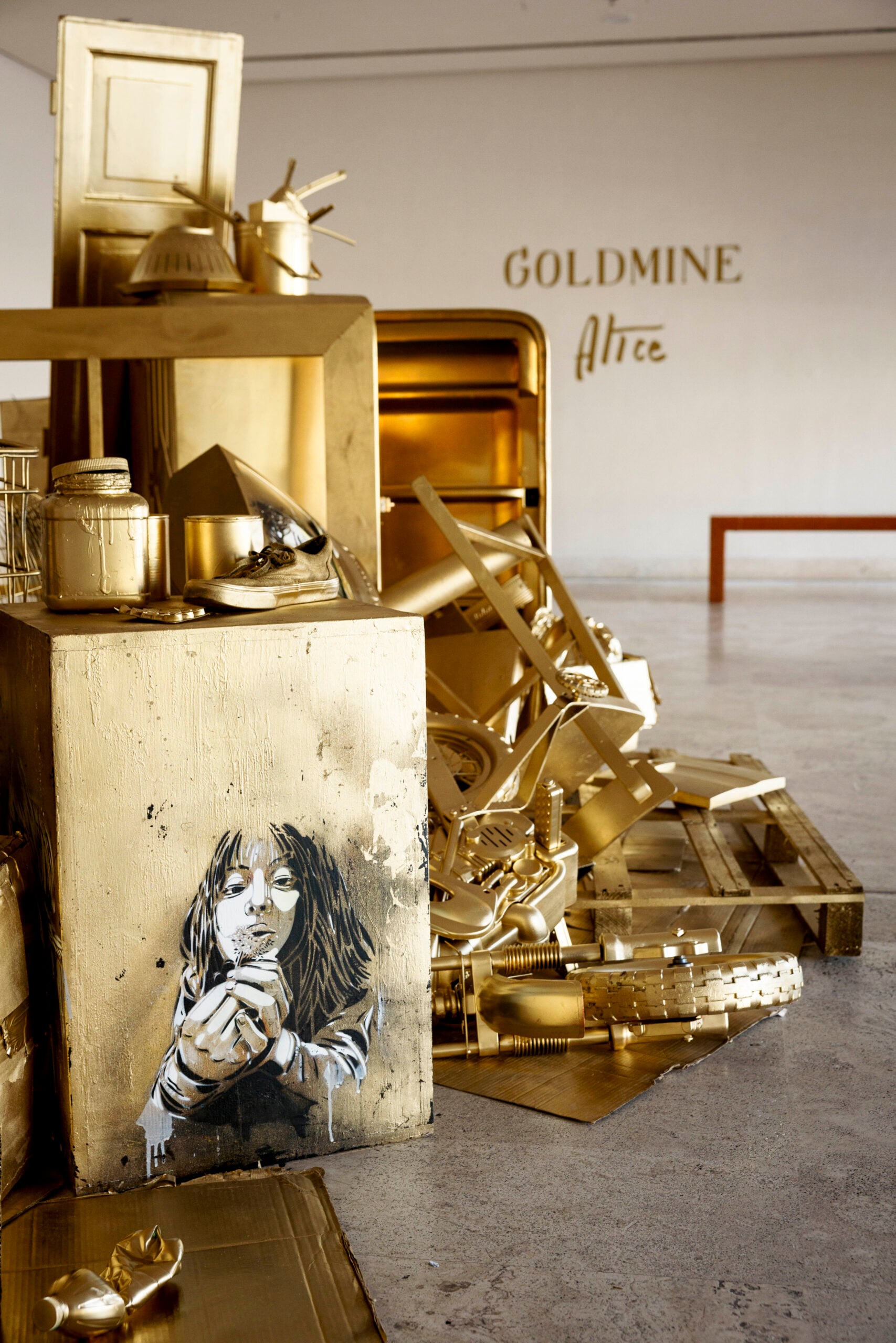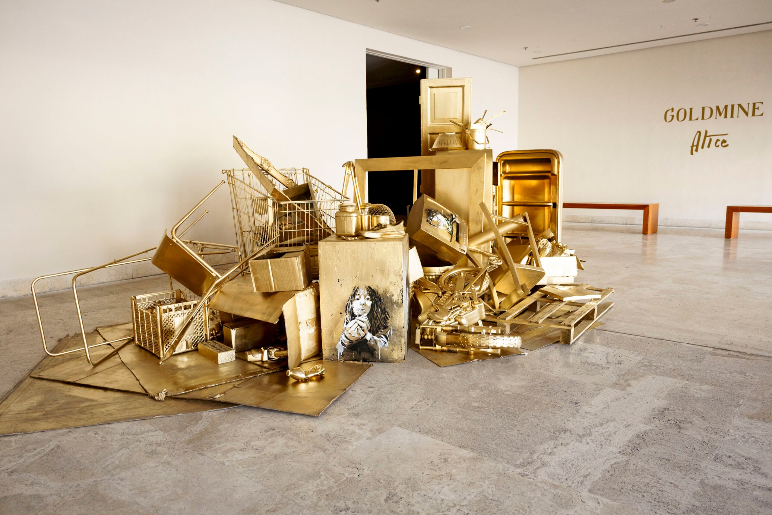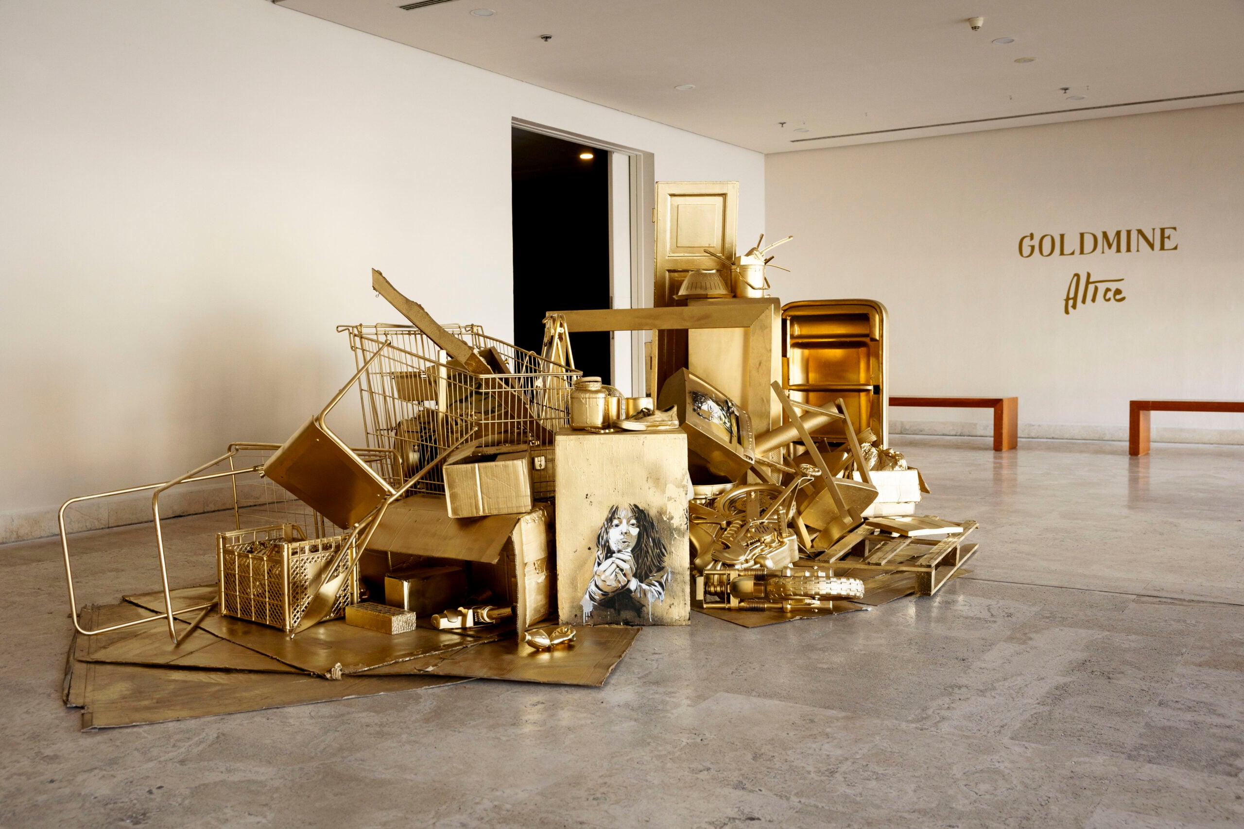 “Con ‘Goldmine’ ho voluto creare un cortocircuito visivo: un ammasso di rifiuti ricoperto d’oro che diventa improvvisamente seducente”, spiega Alice Pasquini. “È un gesto semplice ma destabilizzante, perché mostra quanto il valore sia una costruzione collettiva e quanto facilmente possiamo essere attratti dalla superficie”.