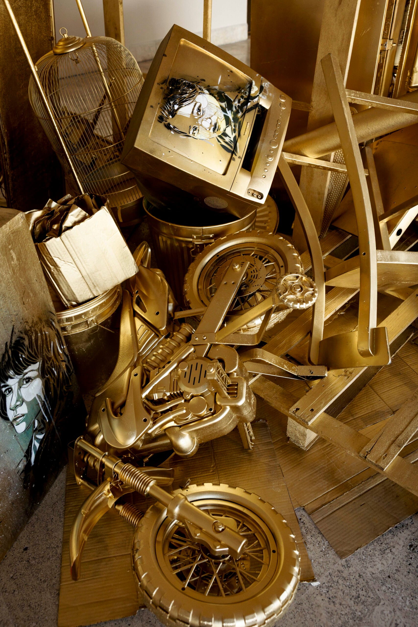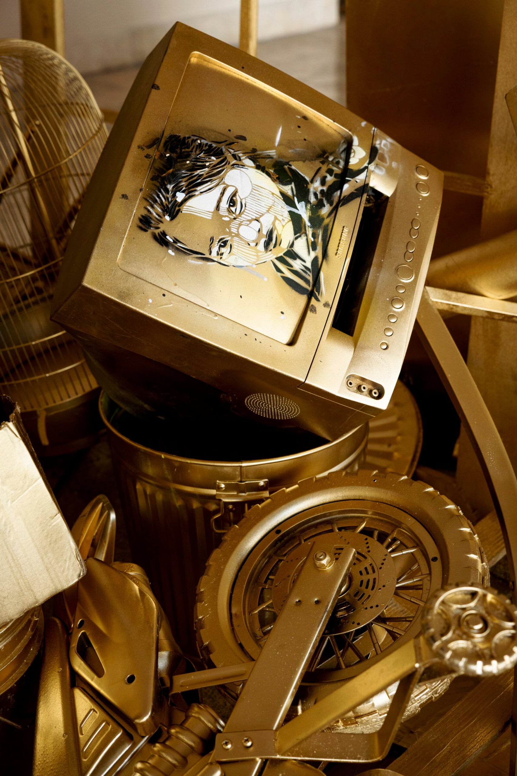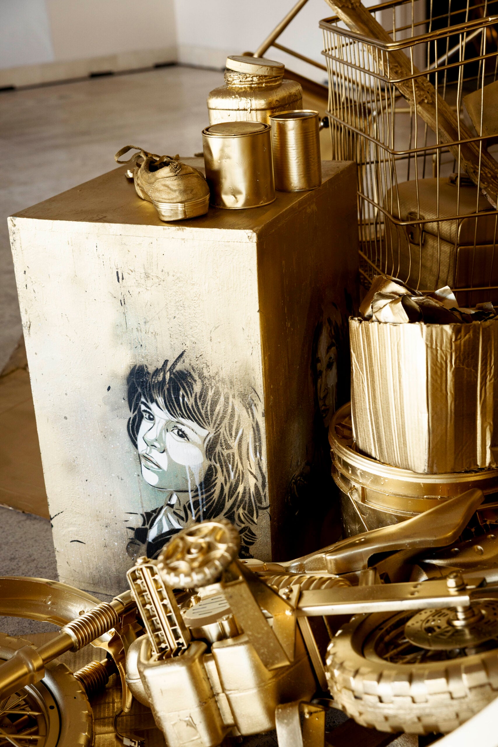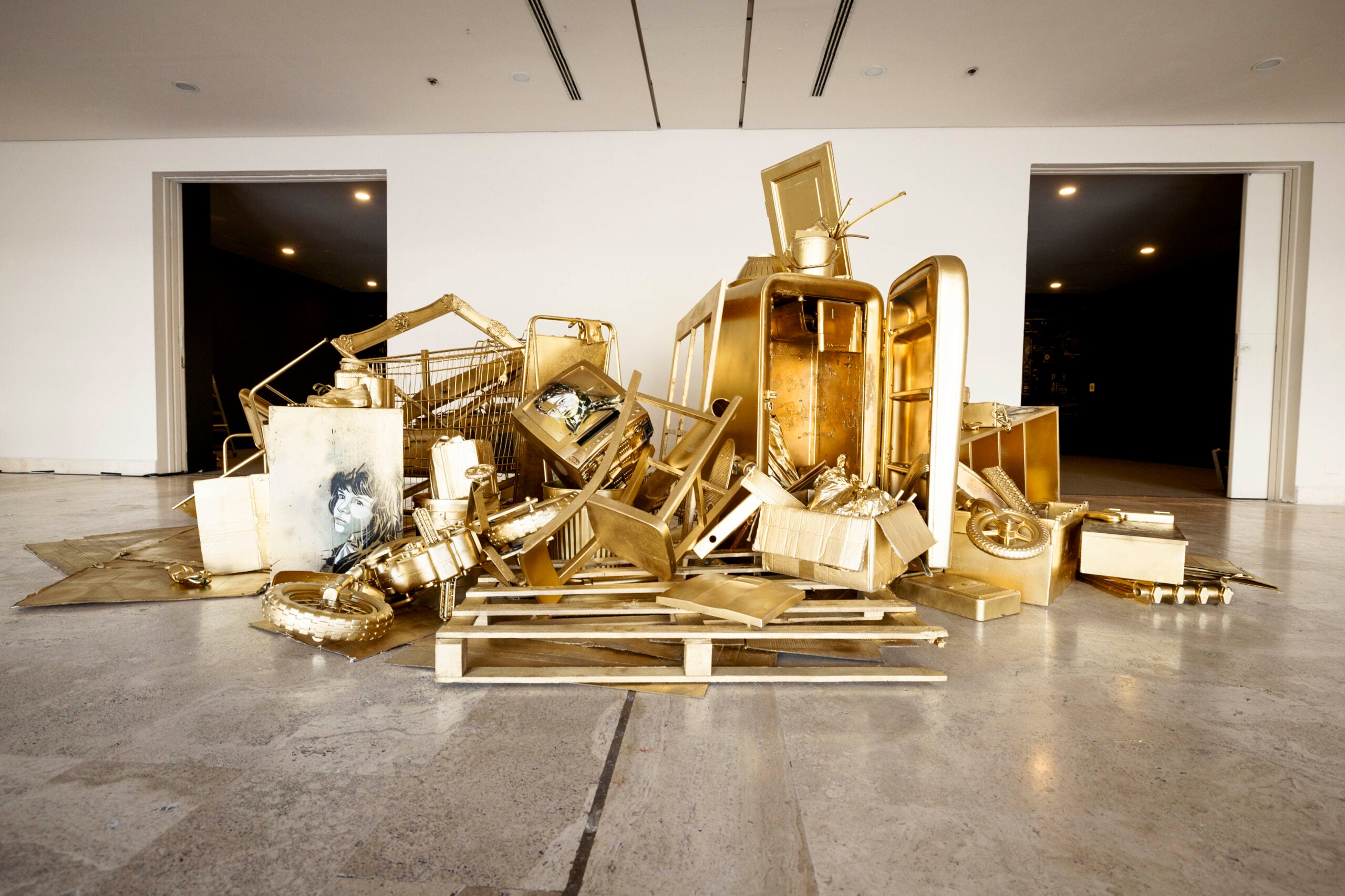 “Con ‘Goldmine’ ho voluto creare un cortocircuito visivo: un ammasso di rifiuti ricoperto d’oro che diventa improvvisamente seducente”, spiega Alice Pasquini. “È un gesto semplice ma destabilizzante, perché mostra quanto il valore sia una costruzione collettiva e quanto facilmente possiamo essere attratti dalla superficie”.
