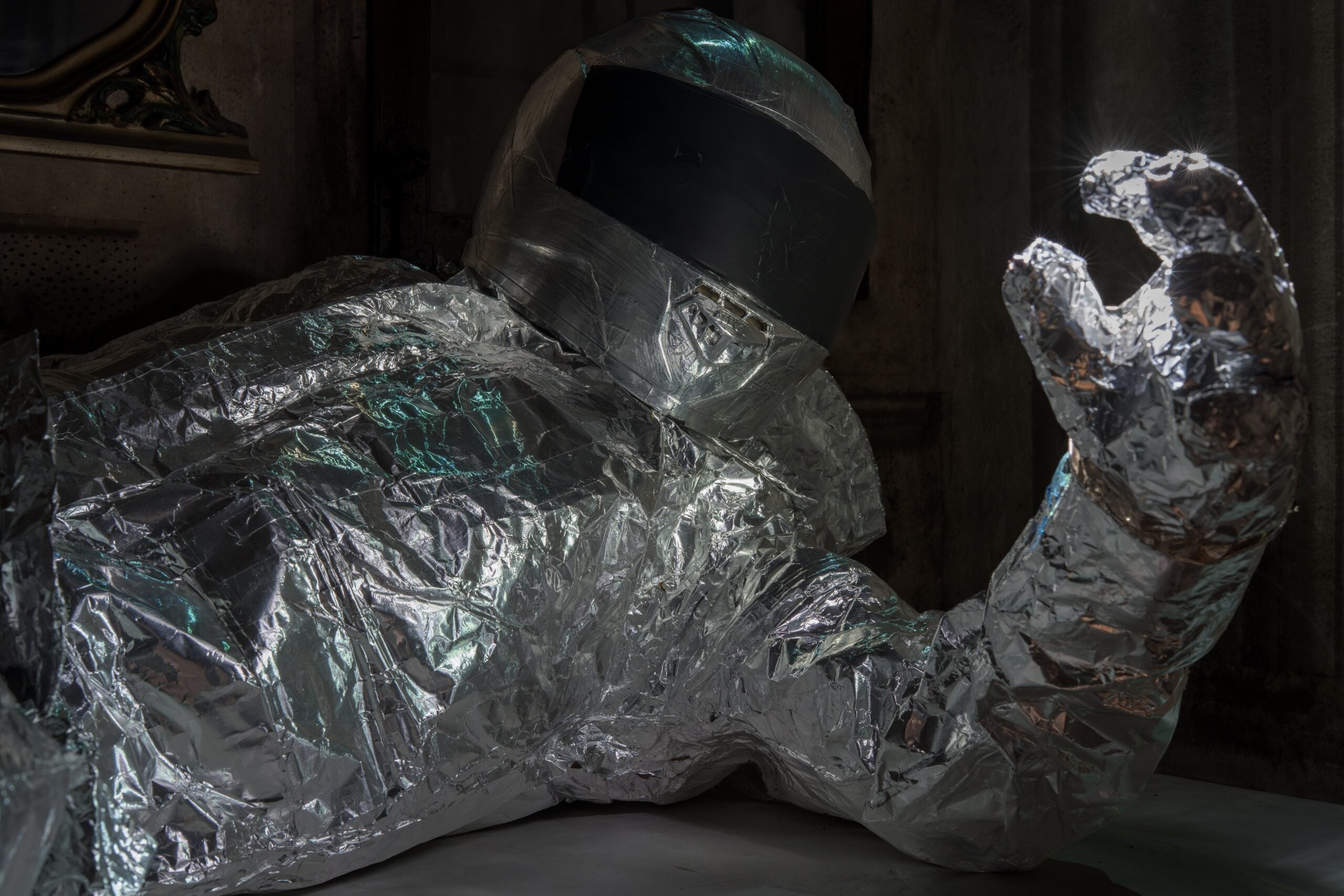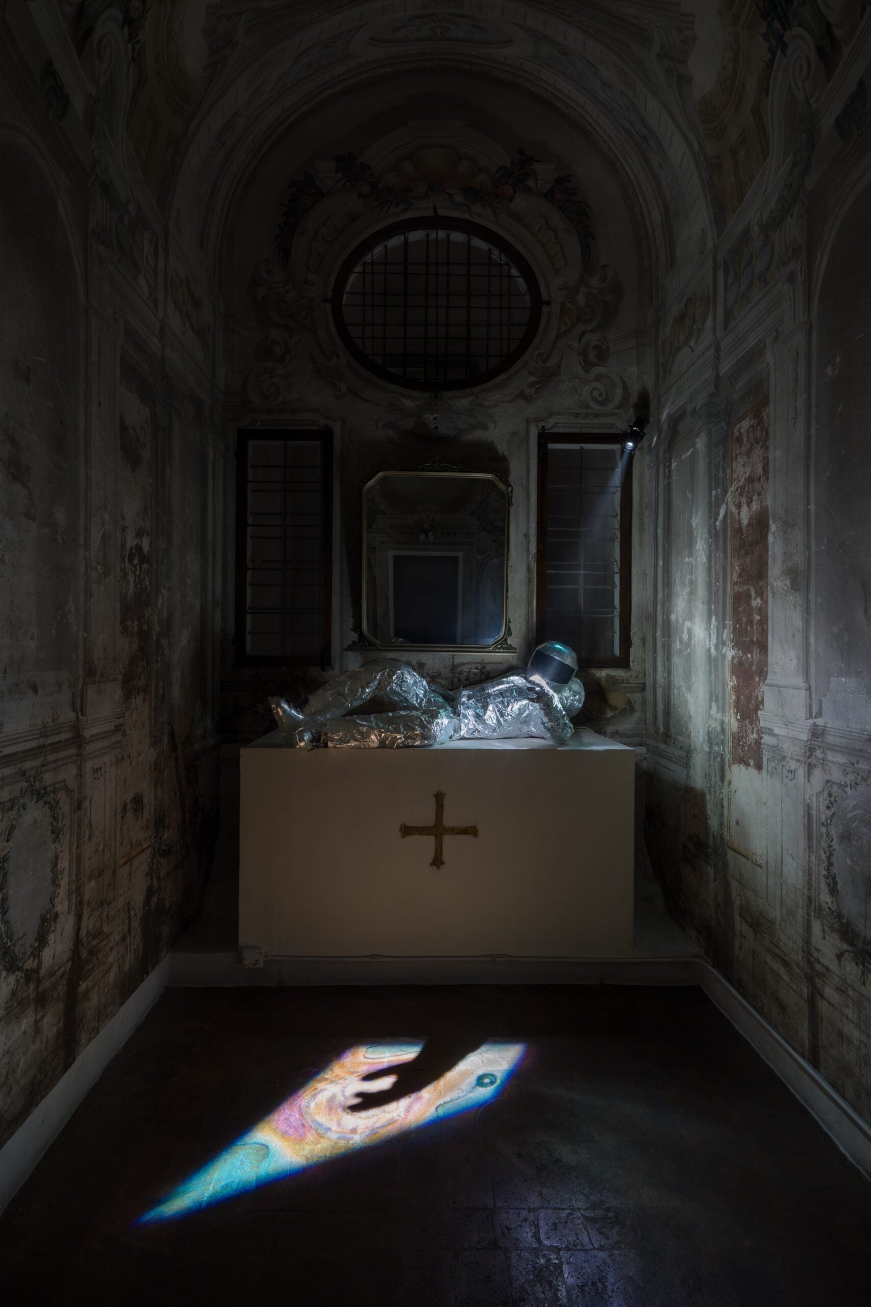 Oggi il percorso della galleria prosegue con “Permanent Loss of Signal”, mostra personale di Valerio D’Angelo curata da Niccolò Giacomazzi, visitabile fino al 15 marzo 2026. Il progetto presenta una serie di opere inedite e installazioni site-specific che trasformano radicalmente gli ambienti della galleria. L’artista costruisce un paesaggio sospeso, quasi post-catastrofico, in cui l’architettura diventa parte integrante della narrazione. All’ingresso, una grande antenna satellitare in movimento continuo sembra tentare invano di captare un segnale lontano. È il primo indizio di una storia immaginaria: quella di un incidente indefinito che ha lasciato dietro di sé tracce silenziose e frammenti di memoria. Da qui prende forma una riflessione più ampia sulla condizione contemporanea: la solitudine, il desiderio di essere riconosciuti, la fragilità dei sistemi di comunicazione che regolano la nostra vita. La tecnologia appare come una promessa di connessione ma, allo stesso tempo, come possibile causa di isolamento.
