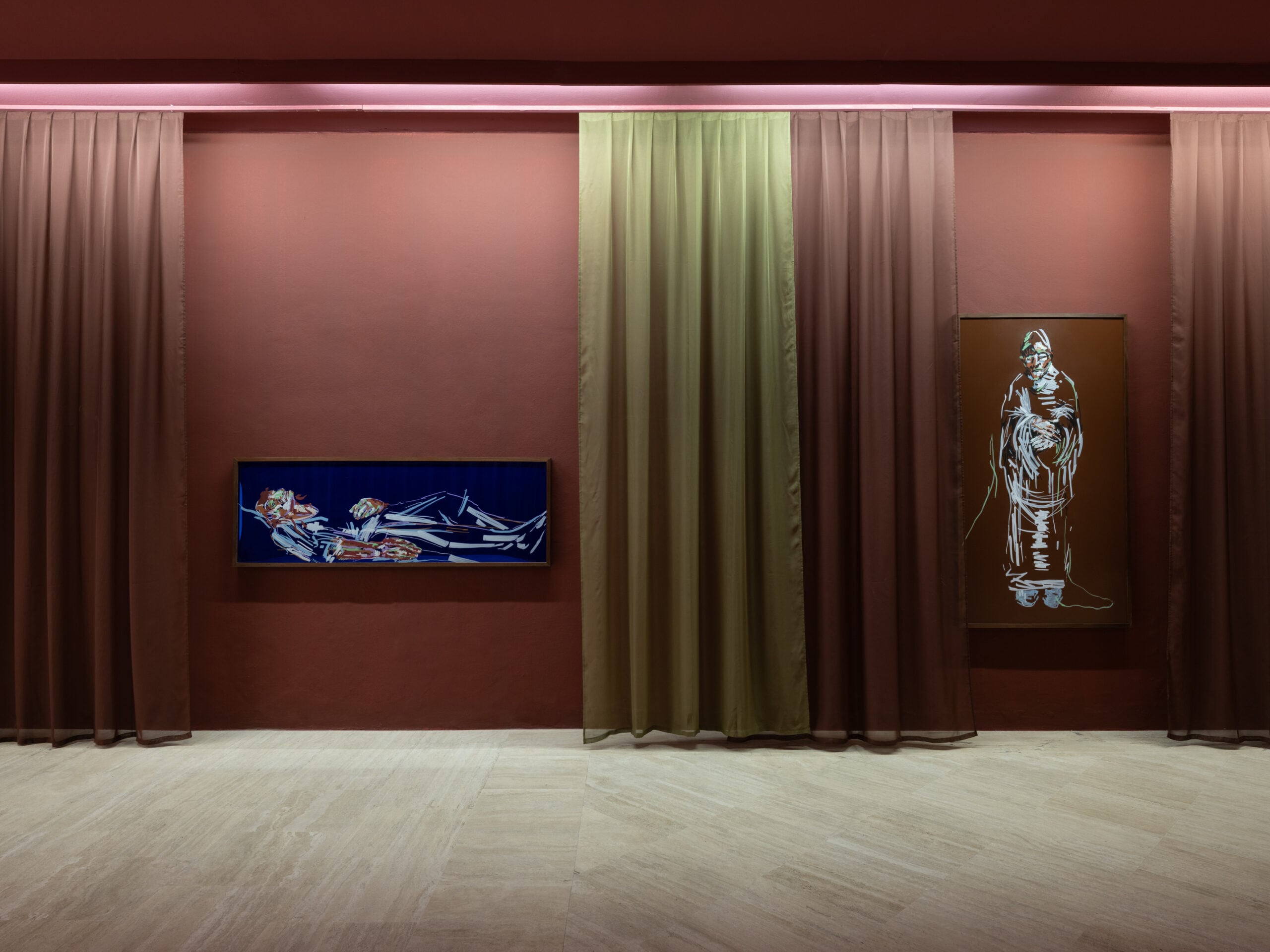 Dal loro canto, Prem Sahib (Londra, 1982) e Paul Maheke (Francia, 1985) lavorano su un piano più leggero e pop: il primo si muove tra archeologia urbana e gender politics in chiave camp; il secondo rilegge memoria coloniale e antiche iconografie funerarie tra tendaggi, superfici riflettenti, pannelli in alluminio specchiato e plexiglass. Cinque visioni sul tempo, tra attesa e accelerazione.