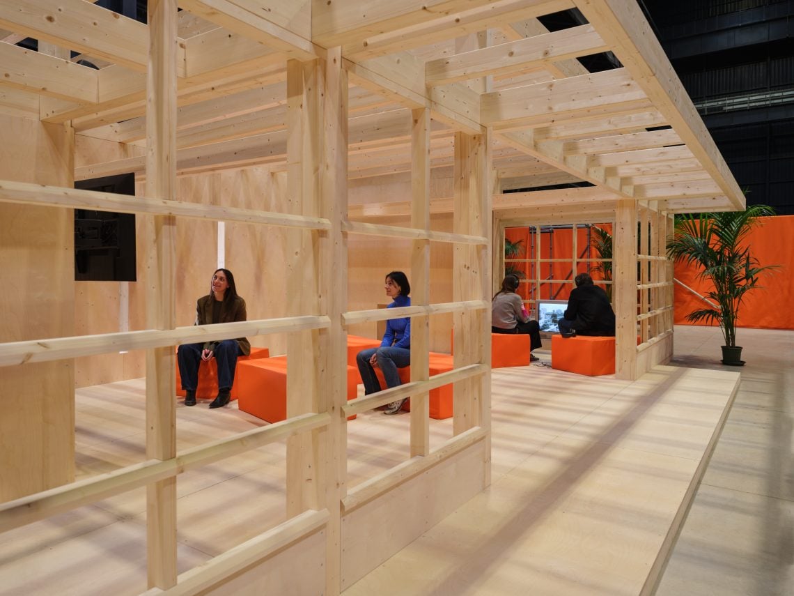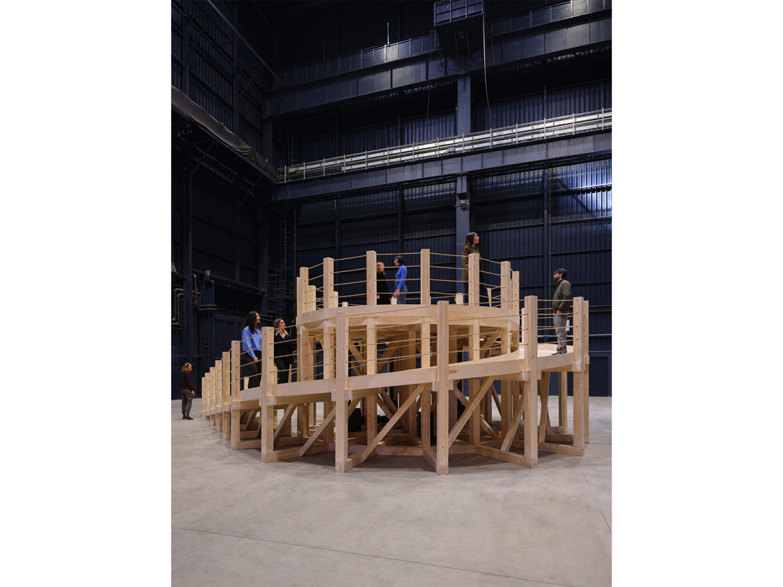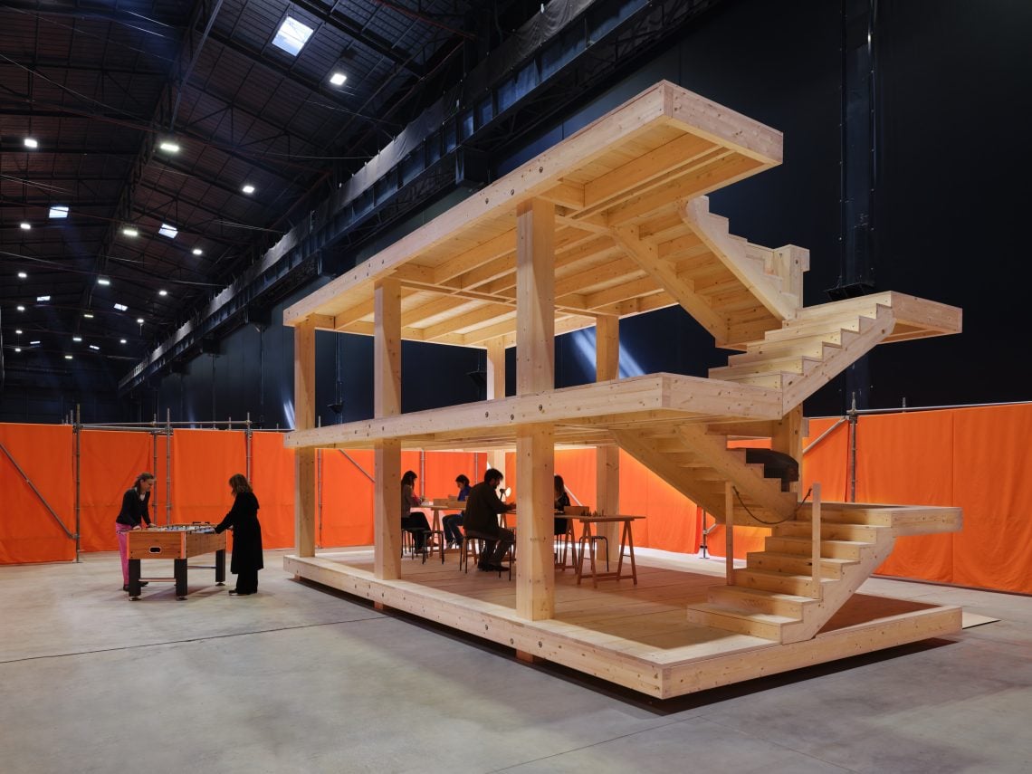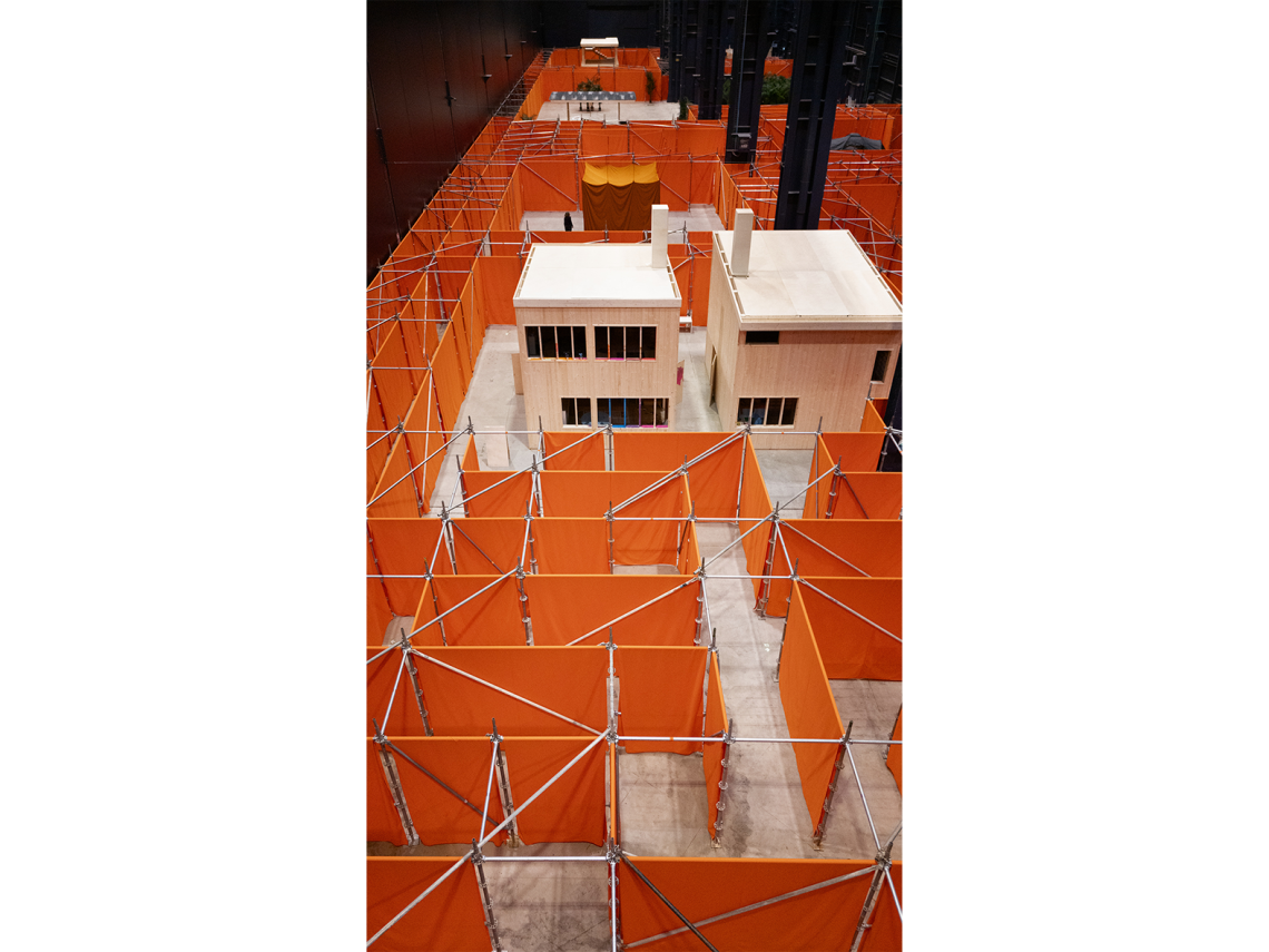 Pianificata per due anni con i curatori Vincente Todolì e Lucia Aspesi, la mostra si apre con un omaggio alla Raumbühne di Frederick Kiesler, un palcoscenico sconvolto che invece del proscenio si articola in una torre. Dall’alto, guardando alle navate, i visitatori riescono a intravvedere il viaggio che li attende: grandi pannelli in tessuto arancione frammentano lo spazio, da cui emergono qui e là piante e strutture di legno. Questo labirinto, che l’artista chiede di navigare senza fretta, non ha una meta: è una strada che porta a casa. Così è prima di tutto per Tiravanija (pronunciato “Tiravanit”), che ha convogliato in questo luogo tutti gli elementi che lo hanno guidato lungo la sua carriera, ma riletti e trasformati per mettere al centro l’interazione umana.