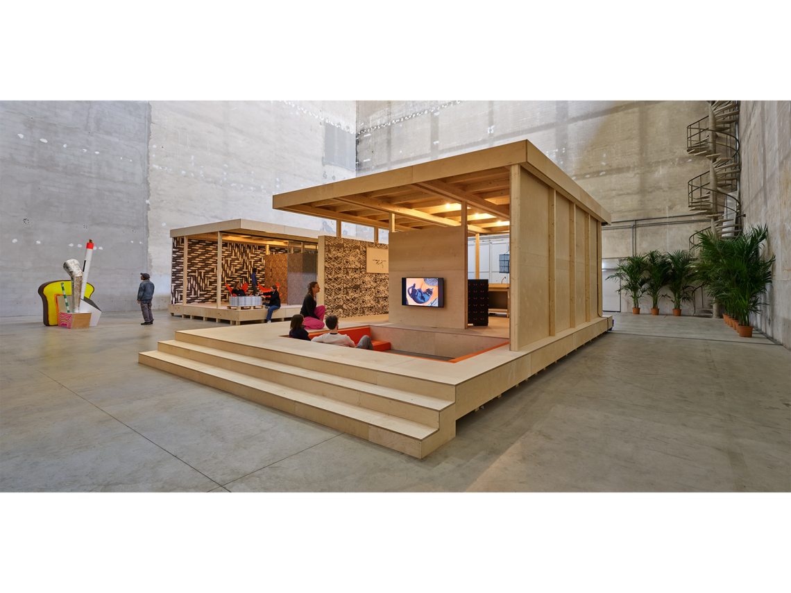 Possiamo sederci a prendere un tè, chinarci nelle tende da campeggio, sfiorare il soffitto nella casa in stile giapponese di Rudolf Michael Schindler; possiamo guardare la trasposizione in cortometraggi di esperienze della vita di Tiravanija nella replica della Glass House di Philip Johnson; possiamo giocare a biliardino nella modulare Dom-Ino di Le Corbusier. Per entrare nella replica della funzionalista casa unifamiliare di Sigurd Lewerentz, però, bisogna essere bambini: le dimensioni sono dimezzate. E poi, tra la giungla di kenzie, spazio alle reinterpretazioni delle case prefabbricata e tropicale di Jean Prouvé (non ricostruita in loco, al momento dell’apertura in viaggio verso l’Italia). Per riposarsi, perché non ascoltare della musica live nella ricostruzione dello studio di New York in cui l’artista improvvisava con gli amici; passando infine per il portale circolare alla Carlo Scarpa (omaggio al Memoriale Brion) si accede al cubo, lo spazio finale della mostra. Che è a sua volta una mostra dentro la mostra: Tiravanija riunisce e cura opere di Bayrle e Kogler, Pardo e Kuri, Shimabuku e Rehberger, Krisanamis e Kolding, Slominski e Rosler.
