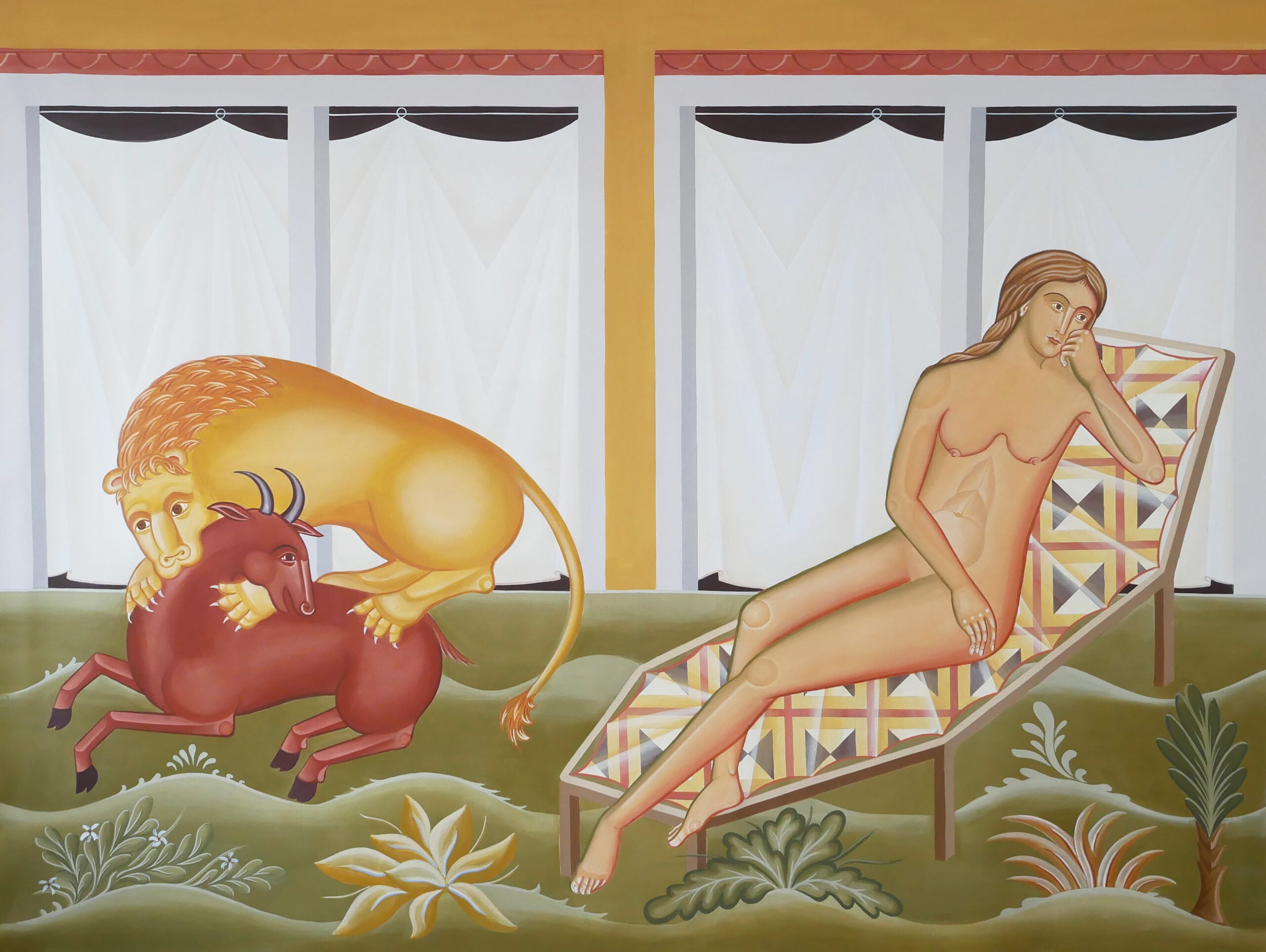 Forse non bastano questi barlumi a illuminare la strada della pittura di Nones al di fuori di un campo citazionistico che se da un lato lo rende riconoscibile, dall’altro ne limita la fertilità nei confronti del discorso artistico contemporaneo e della pittura stessa. E per quanto ricercata, la freddezza delle sue composizioni risulta fin troppo affettata, laddove il ribaltamento di un repertorio iconografico già notoriamente statico avrebbe giovato. Esistono tuttavia momenti in cui questo accade, se non sotto il profilo figurativo, almeno sotto quello concettuale. Sono infatti le tele che adoperano i vasi come cornice compositiva e concettuale a rappresentare la declinazione più seminale – secondo chi scrive – dell’universo pittorico di Nones. Nel vaso come portale e portatore di mondi, nella bidimensionalità che nega se stessa e diventa profondità, il pittore riflette in modo fertile non solo sul suo stile e sui suoi soggetti, ma sul medium stesso. E apre un varco su una direzione in cui il passato non è più asintoto irraggiungibile, ma retta tangente e secante della contemporaneità.