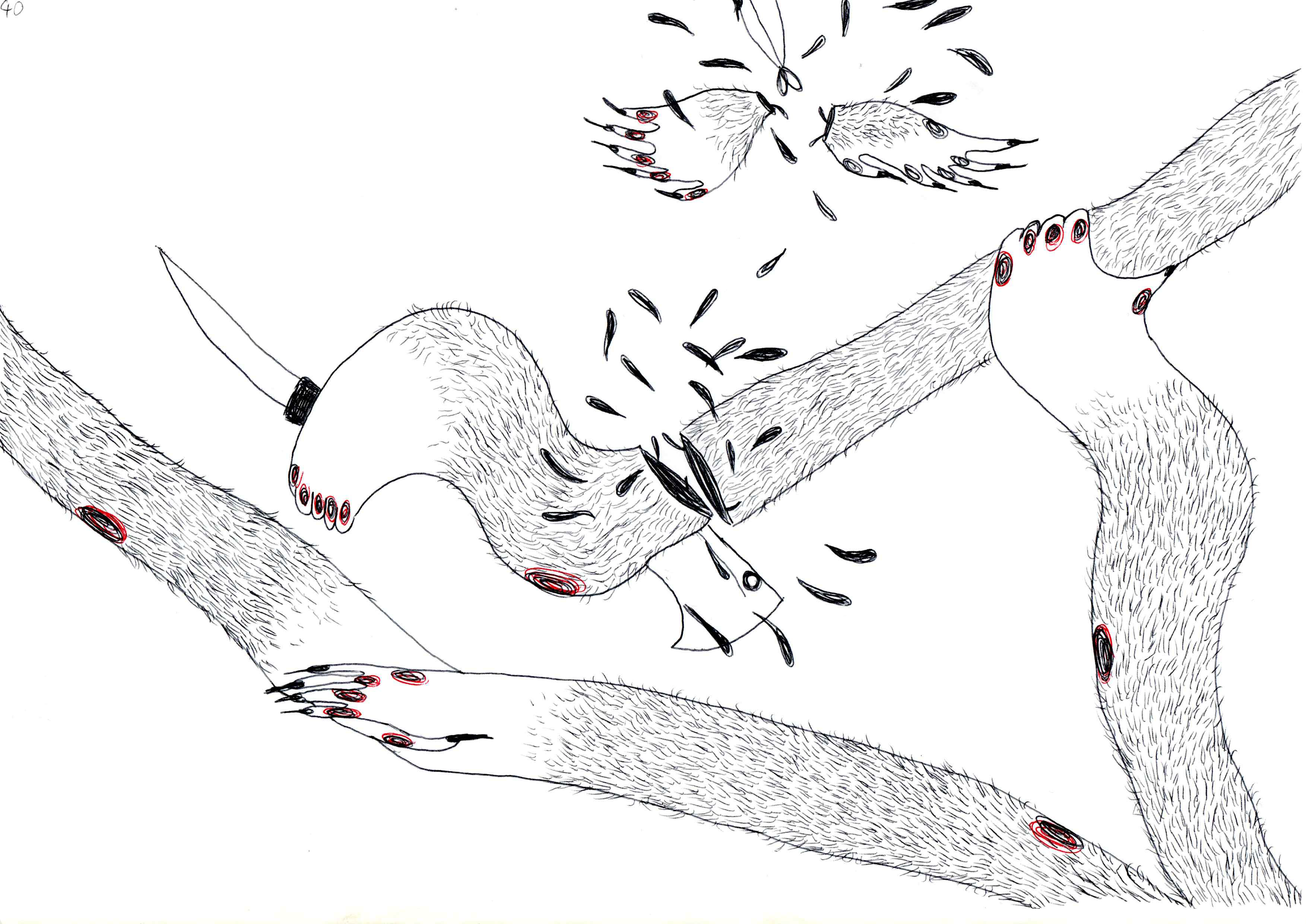 I due ambienti espositivi accolgono gli interventi e le opere dei cinque artisti iniziando con due video che, seppur allestiti in modo analogo, utilizzando un proiettore e un plinto bianco, parlano due lingue ben diverse. Da una parte, il corto stop-motion Rianimati di Morgana Mattioli segue la vita domestica di una coppia di strani, magrissimi esserini con corpi fatti di fili metallici, linguette di lattine e batterie. Lo stop-motion affascina sempre e l’atmosfera à la “Rabbits” di Lynch – ma con più dolcezza e meno ansia – incuriosisce per tutti i due minuti della proiezione. Su un’altra parete della stessa stanza c’è, invece, il loop della video-illustrazione di Beatrice Artunghi, accompagnata da un’installazione che unisce objet trouvé e sculture morbide. L’immaginario di video e installazione è lo stesso, così come il titolo dell’opera: Trucidamente. L’artista riflette sulla ferita, sul suo continuo aprirsi e rimarginarsi, accompagnando un tema difficile con scelte formali quasi infantili e giocose.