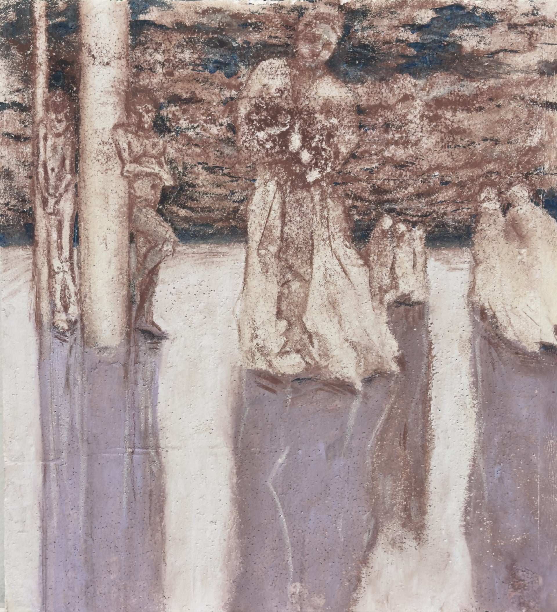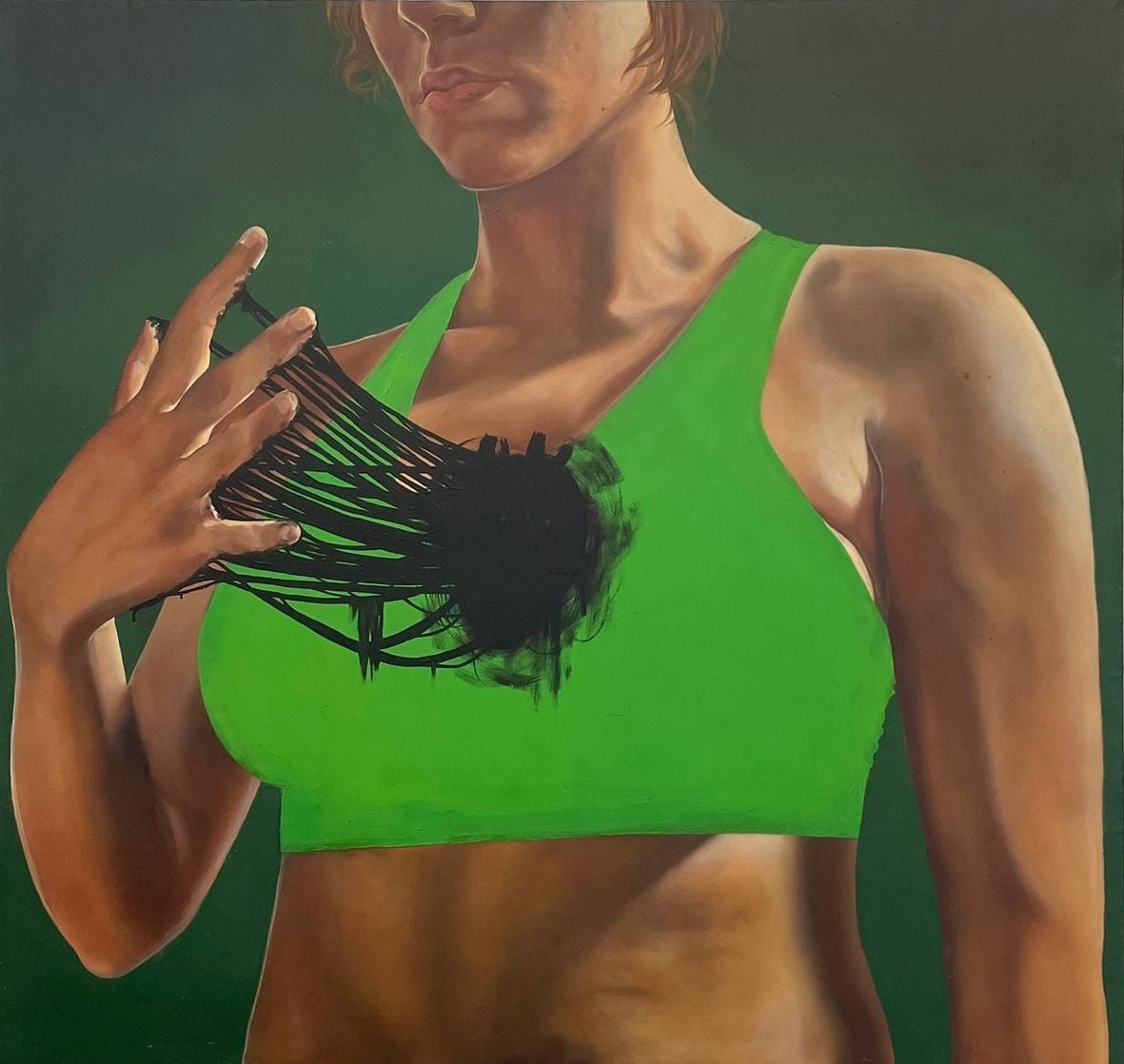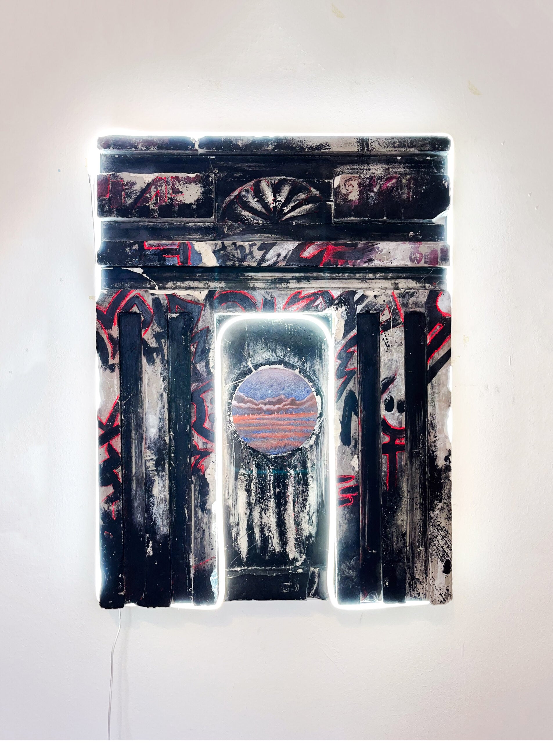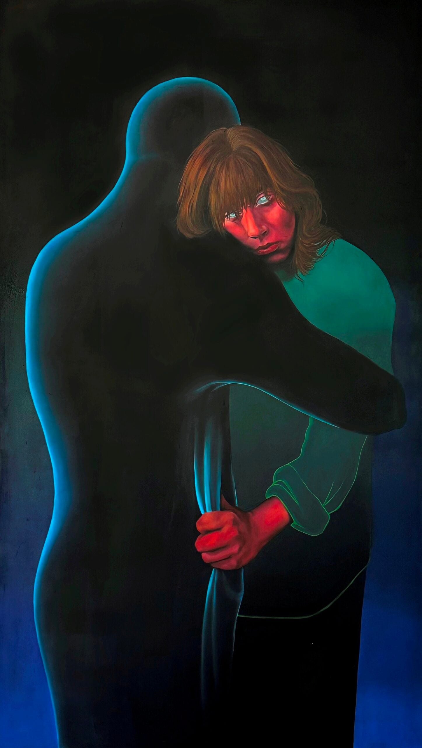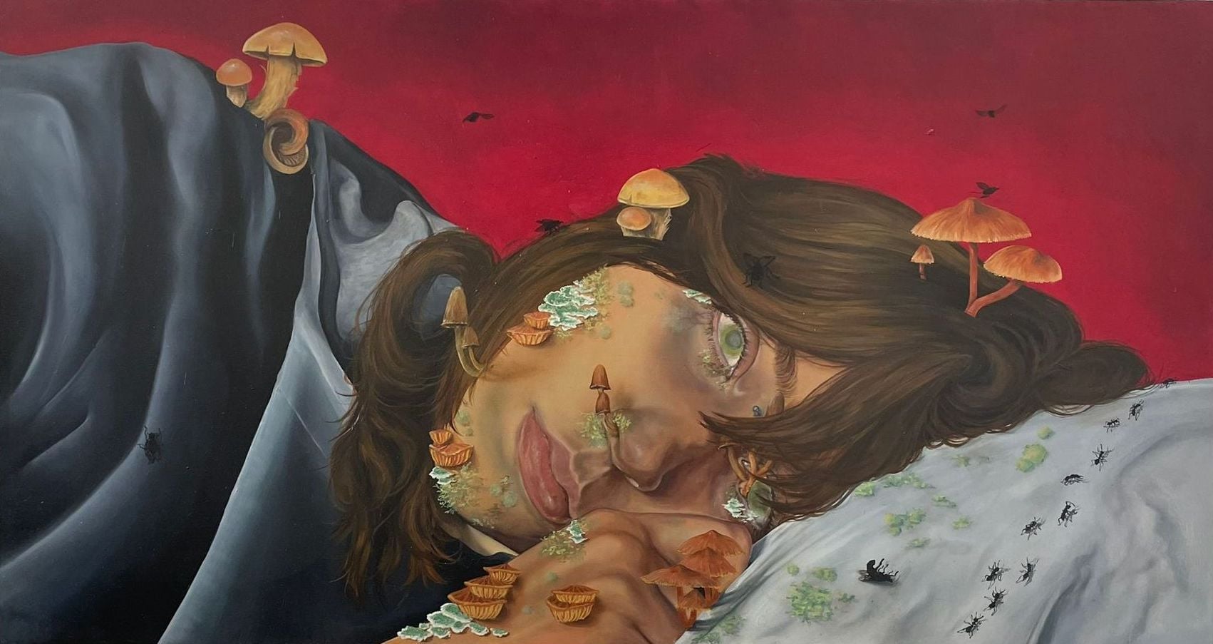 Tra i due video si inserisce il primo dei tre quadri di Irene Vescovo, tutti caratterizzati da un iperrealismo in cui gli inserti di elementi onirici cambiano le carte in tavola e generano atmosfere sospese. Le figure femminili – autoritratti dell’artista – stabiliscono un contatto visivo (in Non ci sei e Bedrotting) o gestuale (in Melanocardia) diretto con chi osserva, nel tentativo di portare chi è fuori dalla tavola dipinta al suo interno. A un supporto pittorico tradizionale, come quello scelto da Vescovo, Roberto Venturini e Luca Balottin preferiscono, invece, soluzioni più sperimentali. Il primo con Onirografia n. 2 (Mausoleo) presenta una visione architettonica dipinta a tecnica mista su una base di cemento e profilato da una luce a neon. La sbrecciatura del materiale e l’allestimento che lascia a vista, penzolanti, cavi e prese elettriche aumenta la sensazione di sfacelo post-generica catastrofe apocalittica: eppure, il mausoleo rimane in piedi. Non cemento, ma polistirolo per Il terzogenito di Balottin che recupera scene, figure e iconografie della storia dell’arte moderna trasportandole nel mondo di oggi, dove quello che dovrebbe essere il supporto materiale garantisce, in realtà, poca stabilità e molto inquinamento – oltre a un bianco ottico che ben accoglie la pittura.