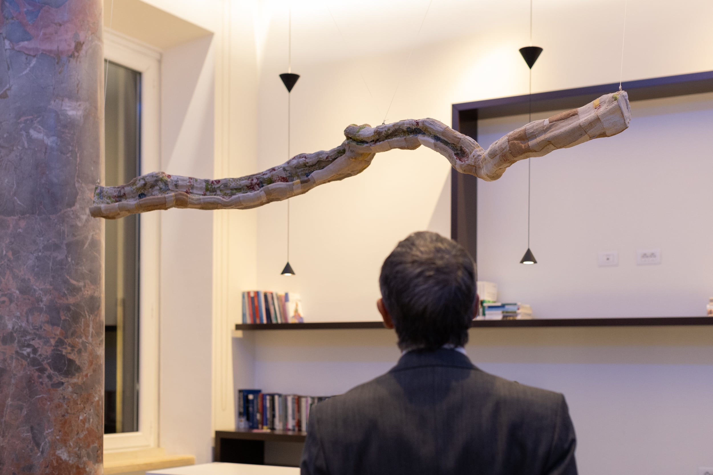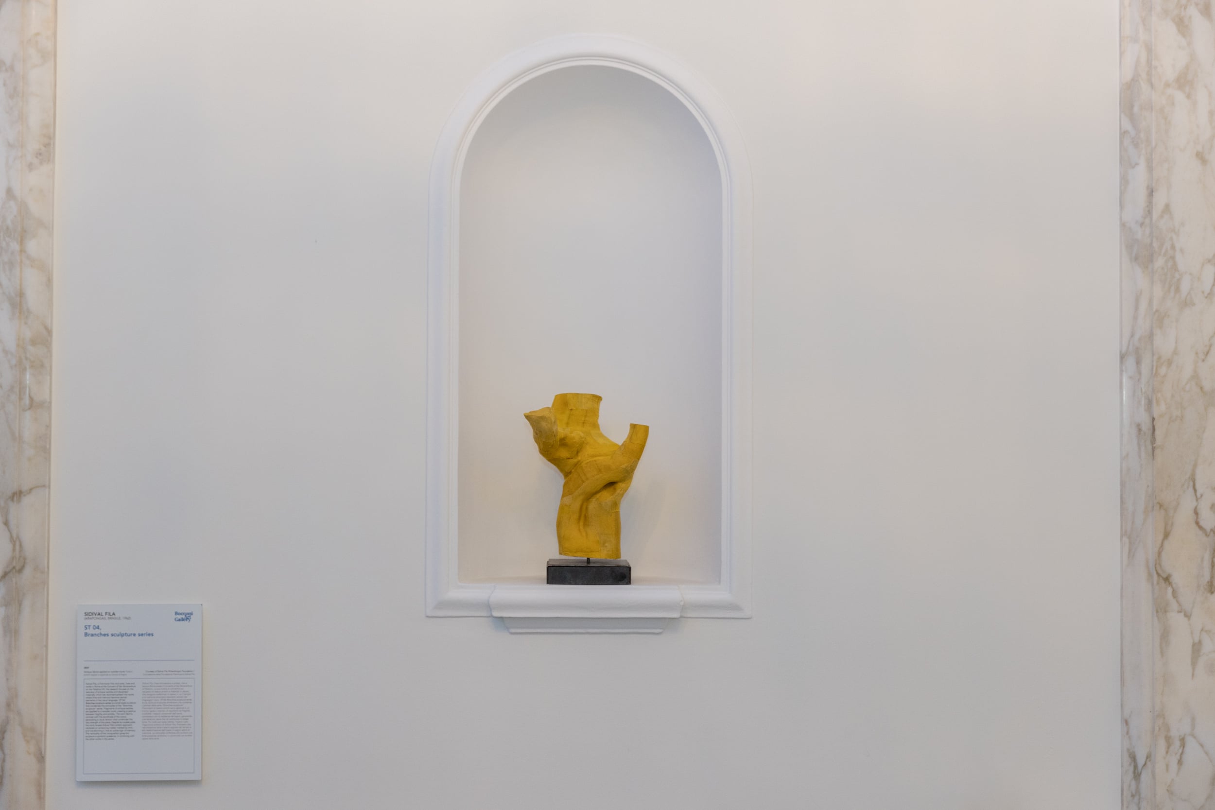 Fila reinterpreta la suppellettile ecclesiastica e apre un’originale dimensione umanistica. Se il paramento contiene un proprio significato liturgico, nella rielaborazione artistica l’oggetto si carica di inediti valori semantici. Il gesto deposita sullo strato un verso nuovo, sedimentato attraverso cuciture, tagli e rimodellamenti. In ST 04, Branches sculpture series (2021) brandelli di tessuto sono applicati su un supporto in legno e operano un bilanciamento tra consistenza e leggerezza, immanenza e trascendenza.
