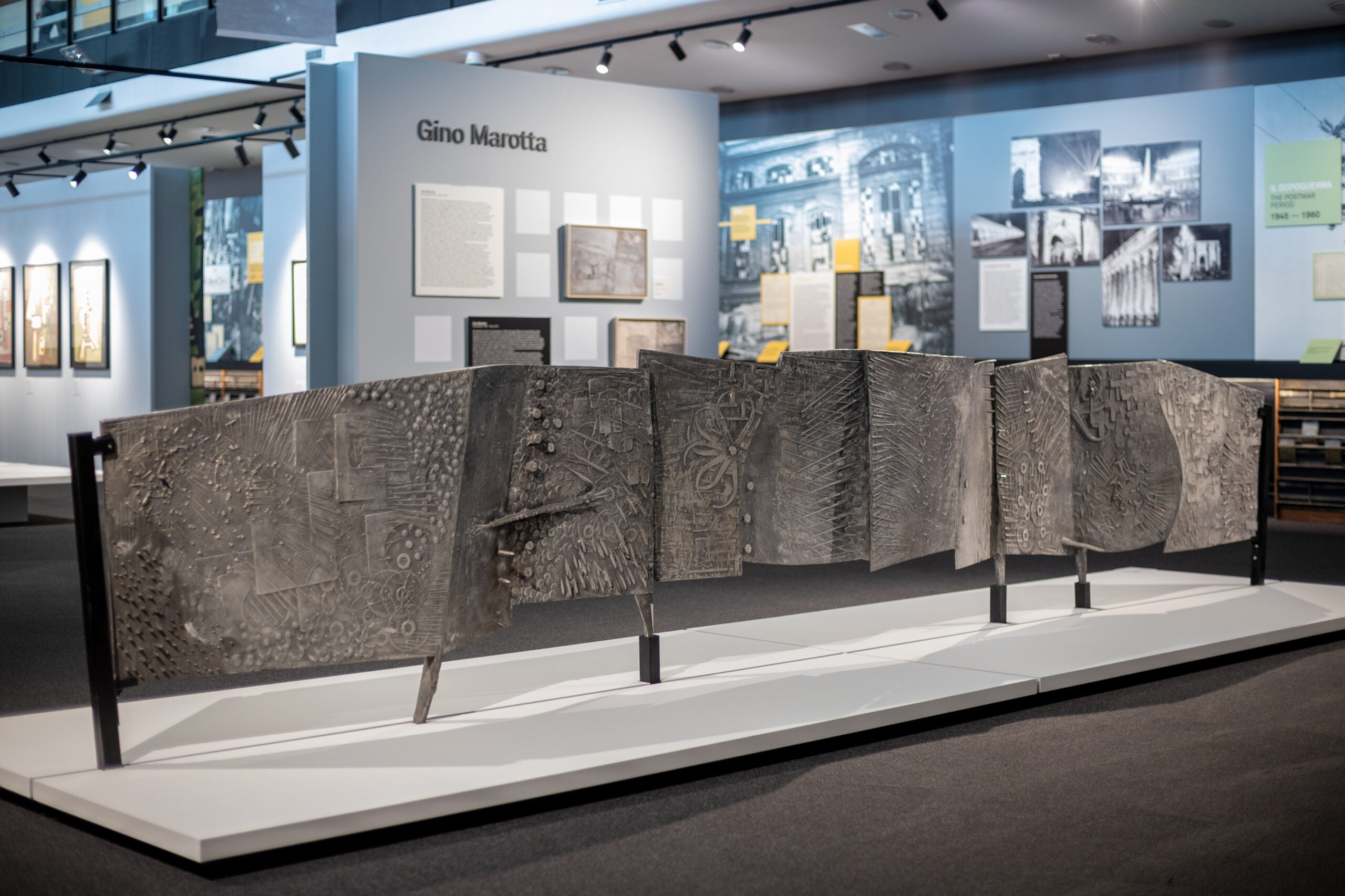 Lavori sperimentali, in bronzo, alluminio, terracotta, addirittura sabbia e colla per i pannelli installati sul soffitto all’ingresso; di cui per anni si era persa memoria anche a causa della brusca rottura tra l’artista e i vertici aziendali, avvenuta dopo il rifiuto di due progetti: la fontana esterna e il riallestimento del salone del pubblico, ritenuto l’una poco funzionale (il cui progetto è conservato al MAXXI) e l’altro, bloccato in corso d’opera – quando l’artista aveva già realizzato tutta l’installazione in bronzo sul registro inferiore del perimetro dell’incredibile lunghezza di 70 metri lineari, oggi valorizzata – perché considerata eccessiva per il contesto. Entrambe concepite in linea con l’architettura modulare dell’edificio.