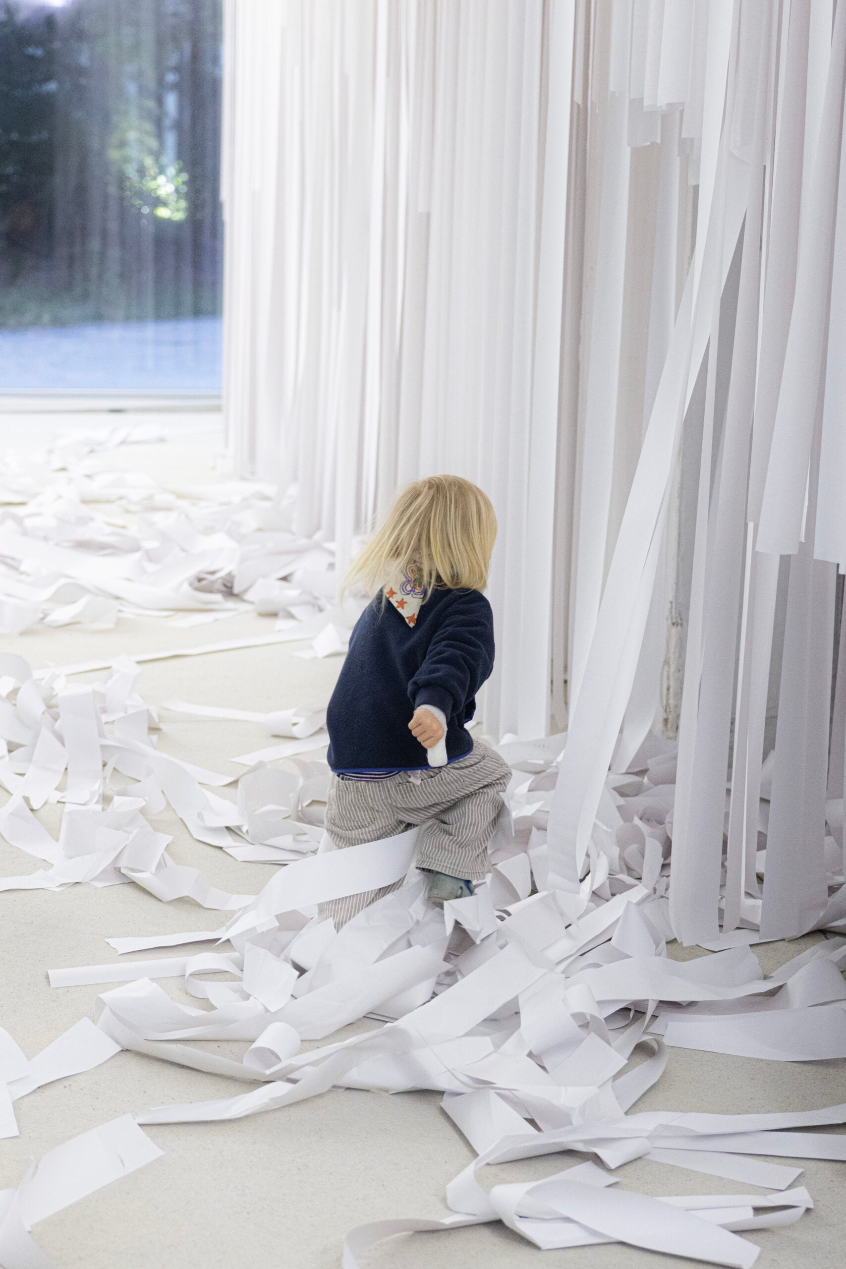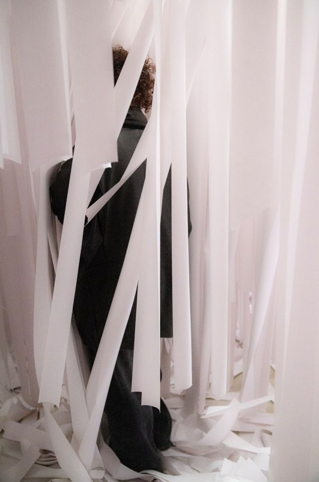 È una foresta di strisce di carta bianca quella che l’architetto-artista chiede al pubblico di attraversare e ritagliare, in una costante riconfigurazione spaziale che necessita la partecipazione attiva del visitatore. Vengono, così, messi in discussione i concetti di fissità dello spazio e di autorialità. “La scelta di portare questo lavoro, nato come lezione in un college, in uno spazio altrettanto legato al mondo universitario deriva anche dalla riflessione sul luogo e su chi lo compone. La molteplicità di anime che rendono viva e reale l’istituzione contrasta con un’idea funzionalista dell’architettura”, spiega Davide Giannella, curatore del progetto.