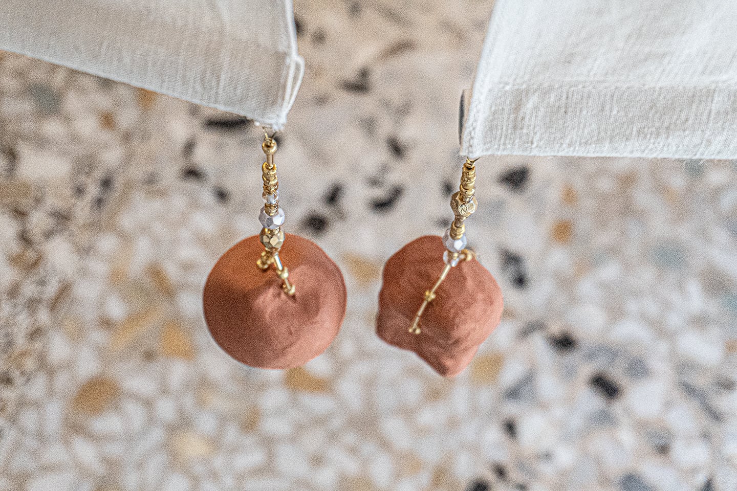 A completamento delle installazioni, una serie di 99 piccoli amuleti in terracotta pendono – come a volerle stabilizzare – dalle leggere strutture. Anche in questo caso, il materiale evoca i toni caldi delle terre e delle costruzioni toscane; mentre le forme, che ricordano elementi naturali – piante, animali, minerali, si possono leggere come “frammenti del cosmo condiviso dalle trentatré voci raccolte”, hanno spiegato la curatrice e l’artista. “Piccoli manufatti che fungono da pesi, creando linee di tensione che vibrano in risonanza con le testimonianze orali incorporate nel lavoro”.