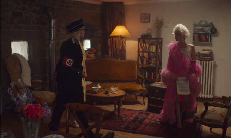 Héroïnes si conferma, dunque, un’ibridazione tra il lavoro di Cahun e Moore, i riferimenti del regista (che attinge prevalentemente dal cinema di genere) e le culture queer e attiviste. “È difficile dire esattamente da dove vengano le cose, ma penso che tutto sia inscritto in noi, abitato da un inconscio personale e collettivo (…). Per me è importante produrre opere con molti strati di lettura, ma anche avere una trama semplice” continua Desrives. Alla fine Claude e Marcel, inseguite dai nazisti, si lanceranno da una rupe tenendosi per mano come Thelma e Louise. “Ci ha fatto ridere usare questa ben nota immagine della cultura popolare in un contesto più queer/radicale, onirico” conclude il regista. Ancora una volta Cahun e Moore ci danno una lezione di libertà e di autodeterminazione difficilmente eguagliabili, anche per quel pizzico d’ironia incomprensibile agli occhi dei nazisti. Probabilmente il loro unico vero travestimento è stato quello da zitella borghese di mezza età. La loro ultima performance, in permanente e abito floreale.