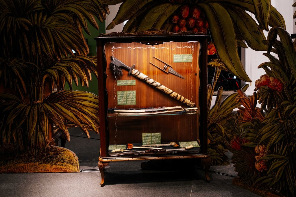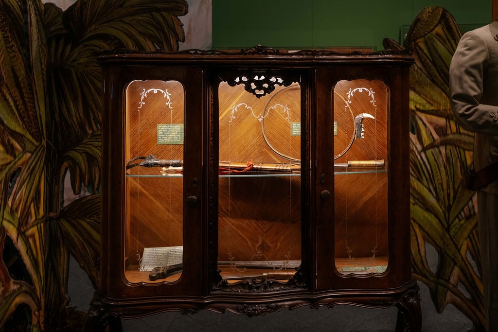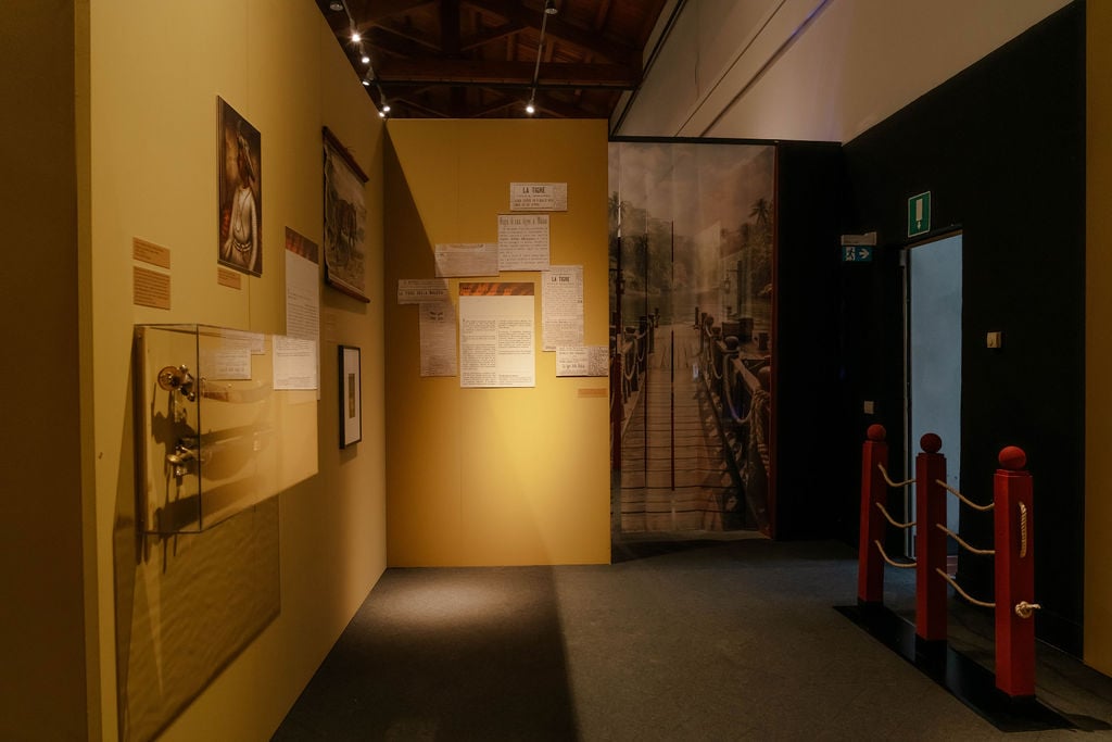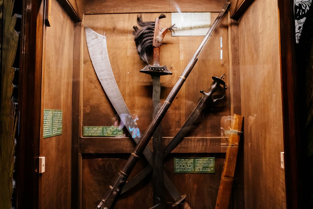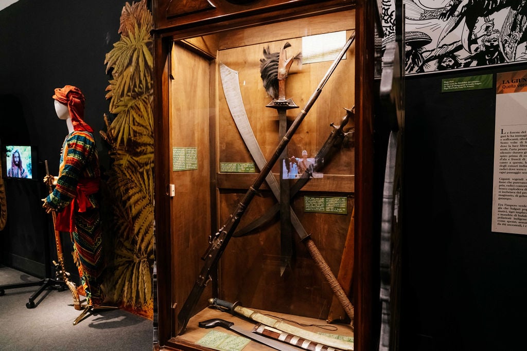 Il percorso porta dentro un Sud-Est asiatico ottocentesco sospeso tra storia e immaginario, dove materiali etnografici e oggetti di scena convivono e si rispecchiano. Per la prima volta viene esposta la collezione originale dei Dayak donata da Sir Charles Brooke al Re d’Italia, accanto ai costumi della celebre serie televisiva Anni Settanta, armi, abiti, libri, illustrazioni e materiali d’archivio. Ne nasce un racconto stratificato, vivo, dove Sandokan continua a trasformarsi e a parlare al presente.