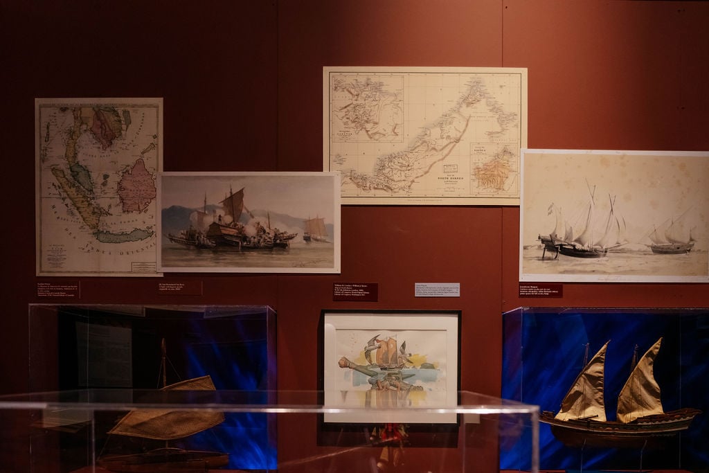 I cartelloni cinematografici, esposti senza vetri né cornici, restituiscono l’impatto visivo dei vecchi cinema, dove l’immagine era già parte dello spettacolo. In dialogo, documenti fotografici ed etnografici tra fine Ottocento e primo Novecento riportano il contesto reale delle popolazioni del Borneo, creando un cortocircuito tra rappresentazione e realtà. Gli accostamenti rendono evidente questa dinamica: i modellini di imbarcazioni indo-malesi dialogano con la Royalist della serie televisiva più recente. Oggetti distanti nel tempo e nella funzione, entrambi sospesi tra realtà e finzione. La tensione resta visibile.