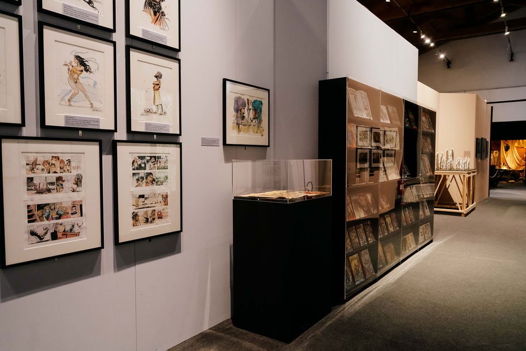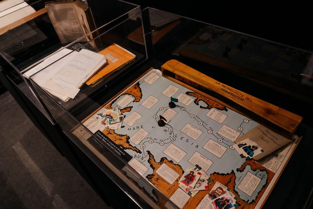 L’allestimento si fonda sull’ambivalenza tra realtà e immaginario, tra vero e falso, estesa anche al rapporto tra epica e storia. Il visitatore attraversa ambienti in cui oggetti autentici e ricostruzioni convivono in una tensione aperta. Il percorso è stratificato: dalle foreste del Borneo rielaborate sull’immaginario editoriale tra Otto e Novecento a spazi sonori e visivi di atmosfera marinaresca. Accanto alle suggestioni, elementi concreti – costumi della serie di Sergio Sollima (1976), armi e abiti Dayak, cartografie e pubblicazioni scientifiche – radicano il racconto nella storia. Le tavole originali di Hugo Pratt e i manoscritti salgariani aggiungono ulteriori livelli. L’allestimento mette in relazione avventura e contesto storico-politico, mostrando come si costruiscano insieme.