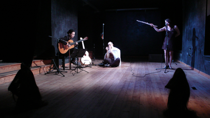 Note per un collasso mentale viene prima dell’accelerazione di questo processo, essendo stato allestito nel 2011. Meno disperato sulle possibilità del linguaggio dei suoi successori, lo spettacolo vive comunque di immobilità, anche e soprattutto quando la recitazione e gli interventi di regia sembrerebbero tendere all’esplosione drammatica. L’accompagnamento continuo della musica dal vivo di Alessandra Novaga contribuisce alla staticità ipnotica dell’insieme. La disillusione ricopre tutto come un velo pesantissimo. E l’adattamento muta persino il “colore” del libro, virandolo decisamente al nero.