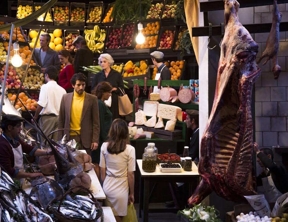 Il titolo a una prima lettura contrasta con la grande tavolozza di colori del dipinto, donato dall’artista all’Università di Palermo nel 1974 e da allora esposto allo Steri, sede istituzionale dell’Ateneo: i rossi delle carni e del pomodoro, gli arancioni degli agrumi, i grigi dei pescispada, i bianchi e i verdi degli ortaggi. Ma in realtà ne coglie la natura più intima e sottile, riprendendo il giudizio che ne diede Cesare Brandi: “Il quadro è tenuto insieme, come una musica dalla tonalità, da quel nero di fondo e visibile solo nei contorni”. Temi su cui si incardina l’opera di Andò e Betta sul testo di Camilleri. “Se la ‘Vucciria’ di Guttuso”, dice Roberto Andò, “si occupa del tempo e della morte, l’opera da noi concepita, affidata esclusivamente al video, alla musica di Marco Betta e alla drammaturgia del silenzio tracciata da Camilleri, insegue quel tempo, scegliendo di tessere il filo mentale delle figure che vi scorrono dentro, l’apparire e lo svanire di un’illusione, ciò che sarebbe potuto essere e non è avvenuto”. L’orchestra e il coro del Teatro Massimo (sul podio Tonino Battista, coro diretto da Piero Monti) hanno dialogato con il film ispirato al dipinto, che vede protagonisti Francesco Scianna e Giulia Andò. I dodici personaggi del quadro, che sono quasi mescolati ai prodotti del mercato, diventano voci dentro il racconto sonoro.