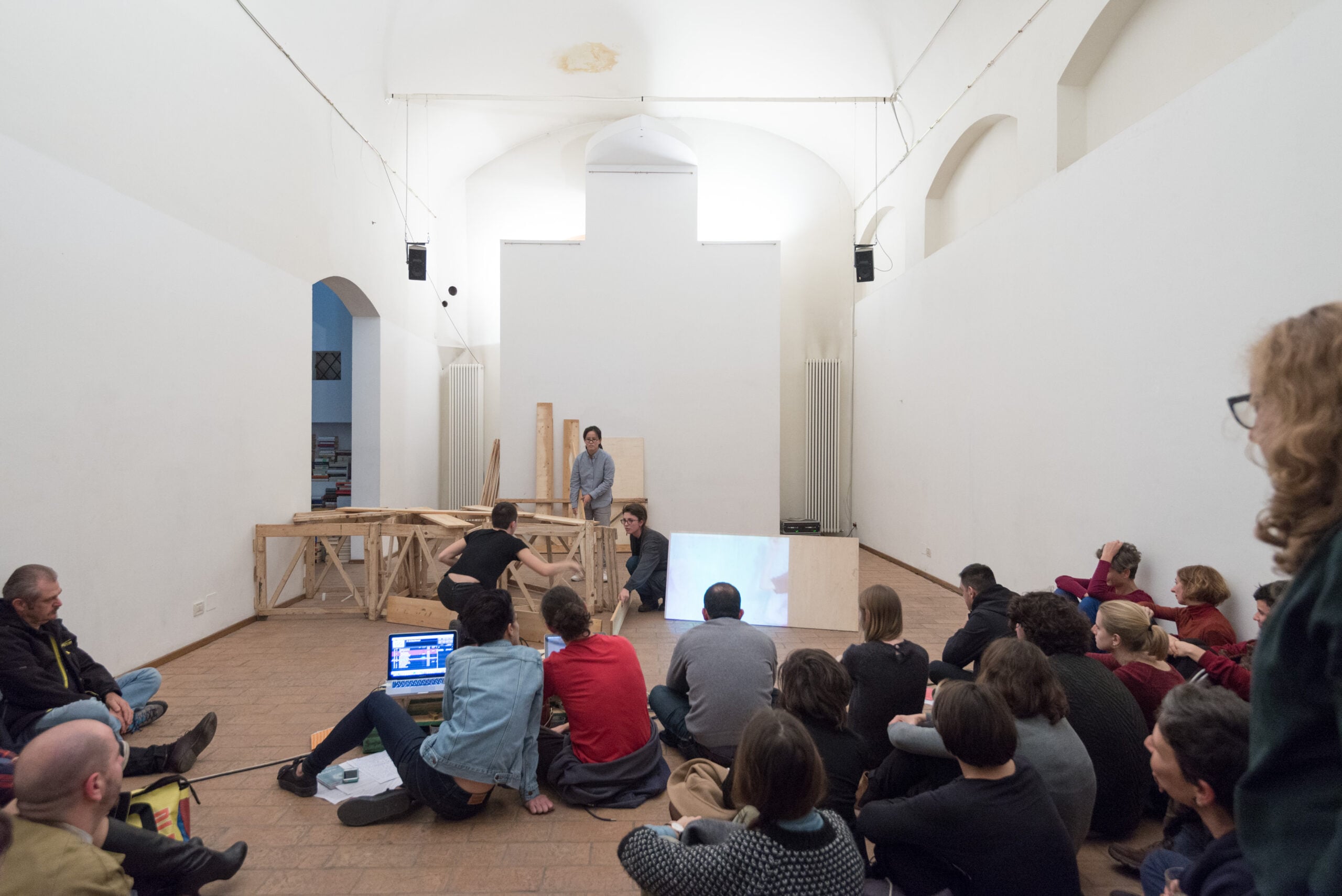 Fulmineamente, durante il flusso della dissertazione, la coreografa raggiunge le tre performer nella struttura polivalente appena realizzata, e all’unisono i quattro corpi “belano”: non sono né fanno le pecore, ma producono un belare, verbo all’infinito, suono penetrante e occhi vacui che danno del tu loro malgrado, che guardano ma non necessariamente ci vedono. Fra la presenza cieca dell’animale e l’occhio ravvicinato dell’antropologo, la “scrittura d’artista” si esercita e ci esercita a uno sguardo allenato alla mobilità fra il flusso dell’esperienza e l’archivio della cultura, fra un presente che è puro “adesso” come quello ovino e un presente che è “l’adesso di una determinata conoscibilità”, di ciò che è dato vedere, sapere, comparare allo stesso momento. Fra l’edilizia contadina organica, frutto di una tradizione secolare e memoria condivisa, e l’alta tecnologia di stampa 3D, che pone medesimi problemi artigianali di gestione e trasformazione della materia (grado di pressione delle frese, punto e profondità di limatura, altezza delle livelle), la tesi vivente mostra e pratica gli effetti di un’intelligenza collettiva, e le condizioni d’esercizio di una creatività che si scontra con la scoperta che nessun luogo esiste da sempre, e che dietro ogni spazio è all’opera una costruzione di cui bisogna conoscere le regole e acquisire le tattiche.