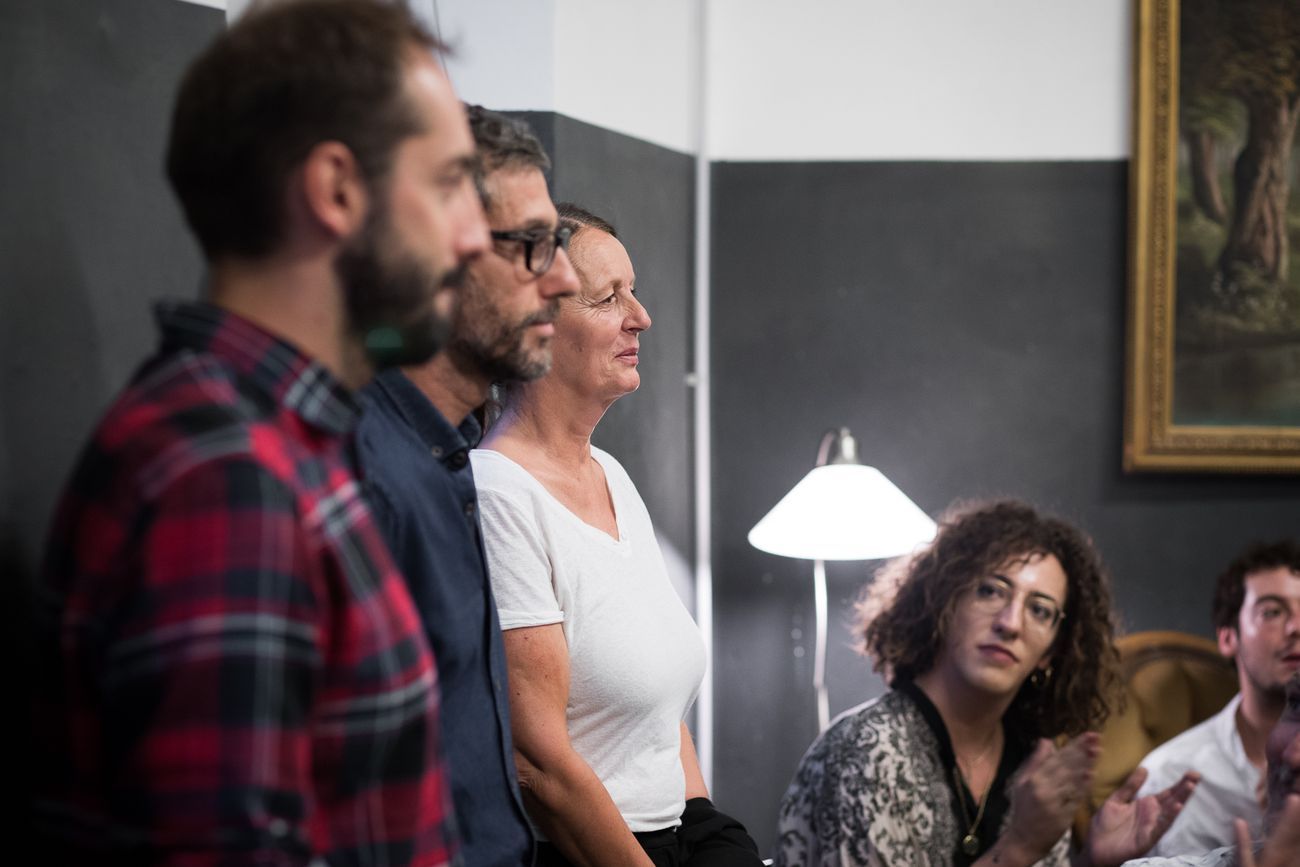 La performance si snoda nell’arco di tempo di una quarantina di minuti, prendendo la forma apparente di una conversazione che si svolge fra tre persone, Daria Deflorian Antonio Tagliarini e Francesco Alberici, giovane coautore e attore il cui taglio della barba accenna a un perturbante giovane sosia dello stesso Tagliarini. Spostandosi tra una piccola assemblea di trenta spettatori contati, seduta su comode poltrone vintage sparpagliate nell’informale quanto accogliente foyer delle carrozzerie|n.o.t. – un attivissimo e ormai famoso spazio romano dedicato al teatro di ricerca e diretto da Maura Teofili e Francesco Montagna ‒, i tre cambiano spesso posto sulle uniche tre poltrone lasciate vuote, narrandosi l’un l’altro l’esito delle loro ricerche nell’archivio ferrarese. Stimolati a voltarsi spesso per ascoltare e vedere chi dei tre stia parlando, gli astanti seguono il dipanarsi dei racconti tratti dal diario di uno degli assistenti alla regia, spesso intercalati da domande e risposte che gli attori rivolgono a sé stessi e agli altri. Sembrano chiacchiere improvvisate lì per lì, divagazioni che restano sospese, domande che non chiedono risposte, ma che sottintendono la propria inefficacia, racconti enfatici che sottolineano con stupore un vuoto esistenziale fallimentare, che sempre fa da sfondo alle pièce del duo.
