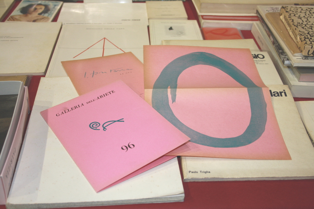 PCCC – Paolo Credi Collectors Consulting (Modena) ha portato un’ottima selezione di cataloghi, libri d’artista – tra cui quelli di Maurizio Nannucci – con particolare attenzione verso i documenti cartacei come gli inviti a mostre soprattutto degli anni ‘60 e ‘70. Notiamo tra gli altri l’invito all’esposizione di Andy Warhol del ’72, la cartolina d’invito di Gino De Dominicis del ’75 con ingresso riservato agli animali; un invito per la mostra di Fontana alla Galleria dell’Ariete. Presso la sezione ALAI (Associazione Librai Antiquari d’Italia) il prestigio era in ogni angolo: le carte decorate e le tavole miniate dello Studio Bibliografico Giuseppe Solmi (Bologna), una copia della prima edizione de Il Gattopardo (Feltrinelli, 1958) con copertina realizzata da Albe Steiner esposta dallo Studio Bibliografico Orfeo (Bologna); così come una tavola pubblicitaria del ’39 di Giovanni Pintori per Studio 42 Olivetti, esibita dalla Libreria Antiquaria Coenobium (Asti): nella prefazione al catalogo dedicato Elio Vittorini fa riferimento all’umanesimo pubblicitario, ovvero a campagne che riuscissero a generare immagini poetiche, a imprimersi nella storia conferendo alla pubblicità una dimensione inequivocabilmente umana.