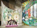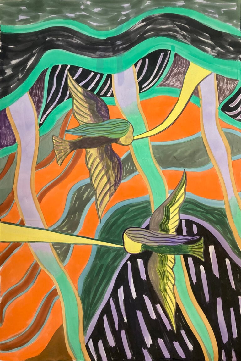 Una poderosa installazione di Emma Talbot (Stourbridge, 1969), curata da Kathrin Becker, occupa gli spazi della Kesselhaus al Kindl di Berlino nella mostra In the End, the Beginning. Ampi teleri di seta dipinta si dispiegano spargendo furie, sirene, arpie, oracoli, spiriti che nella personalissima iconografia dell’artista britannica, classe 1969, portano messaggi sul futuro del pianeta e dei suoi abitanti. Sono presenze fluide supportate da un dionisiaco dinamismo, tendenti al metamorfismo, soggetti erranti che trasmigrano dal supporto bidimensionale alla plasticità delle sculture tessili. Nel passaggio di scala restano invariate le forme semplificate, onuste di riferimenti mitologici, di suggestioni arcaiche, con didascalie in inglese e tedesco (omaggio brechtiano?), in tondi stampati che cercano di renderci coscienti. I testi inseriti in balloon da graphic novel spingono didatticamente a interrogazioni sul presente, su tematiche che includono ambiente, tecnologia e eco politica, Una pittura fitta, affetta da horror vacui, abitata da creature con più arti, come una sorta di deriva teratogenica in un ambiente tossico tra umano e vegetale, ribadisce la necessità di una rinegoziazione tra natura e esseri viventi.