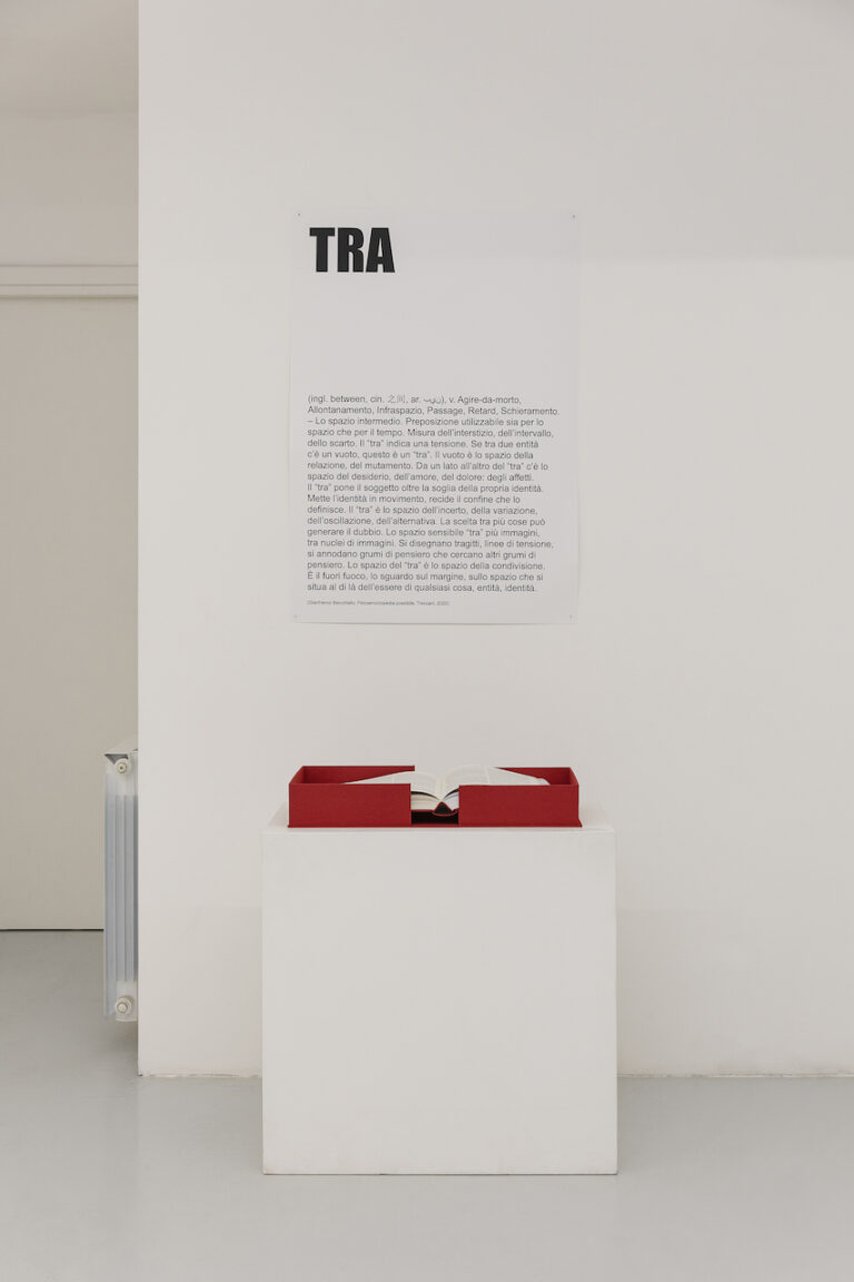 La Psico-enciclopedia possibile di Gianfranco Baruchello è l’opera da cui parte “Tra”, prima personale di Fiamma Montezemolo presso la medesima fondazione, organizzata nell’ambito del ciclo espositivo 3 x 3 x 3 a cura di Carla Subrizi, per il centenario della nascita del maestro. Il lemma Tra, scelto dell’artista come titolo della mostra, viene definito come: “Lo spazio intermedio.