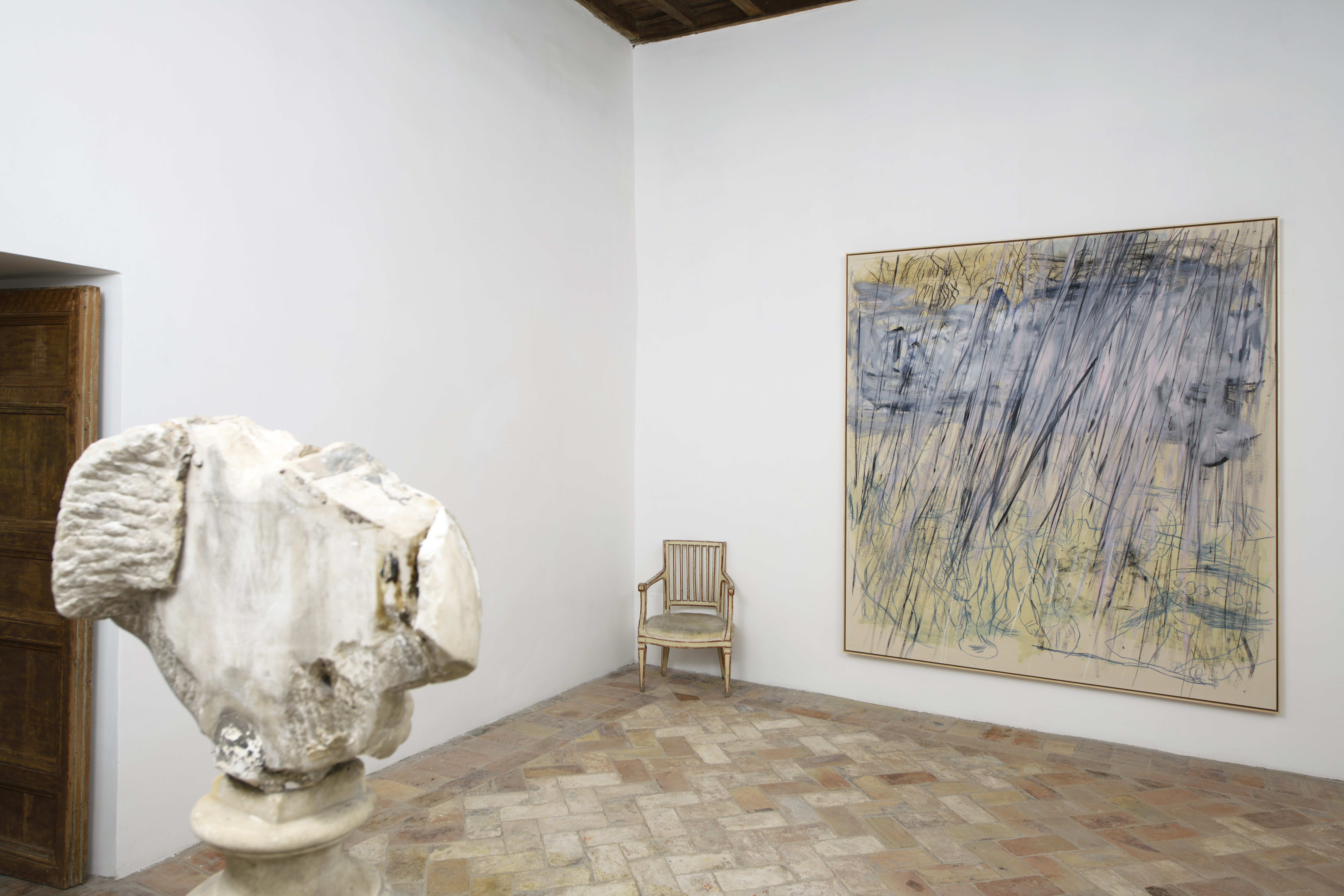 Oggi Palazzo Twombly, dopo un lungo restauro ad opera della famiglia, è la sede della Fondazione Iris, aperta nel 2023 da Caio Twombly, nipote dell’artista e fondatore della galleria Amanita, che ha sede a New York. Ogni anno la fondazione ospita la mostra personale di un artista organizzata da Amanita: quest’anno è la volta di Rita Ackermann (Budapest, 1968), basata a New York e molto vicina all’immaginario di Twombly. Manna Rain riunisce 16 opere tra dipinti, disegni e video, distribuiti negli ambienti del palazzo, dalle cantine al terzo piano. In un armonioso accordo con l’arredo minimale e rarefatto degli ambienti, che si potrebbero definire “spazi etruschi” per l’elegante essenzialità dei pochi ma significativi arredi, tra i quali spiccano una serie di sculture classiche, rivisitate da Cy in maniera sottilmente contemporanea.