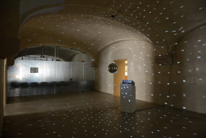 Al piano terra abitano opere iconiche come Performing Time, 2012, di Ivan Moudov (Sofia, 1975) video in cui l’artista per 24 ore, senza l’ausilio di alcuno strumento, tiene il tempo, spostando manualmente le lancette dell’orologio al trascorrere di ogni minuto. Sforando, in questa riflessione metaforica sul tempo, di soli 16 minuti in tutto l’arco della giornata. Ancora, la suggestiva installazione immersiva The glamorous Marlene Dietrich performs Pete Seeger “where have all the flowers gone?” ove Conrad Ventur (Seattle, 1977) partendo dal video d’archivio in cui la diva a Londra nel 1972 interpretò il brano di Seeger, attraverso una palla da discoteca moltiplica il volto dell’attrice facendone l’unica stella del firmamento acceso nella stanza.