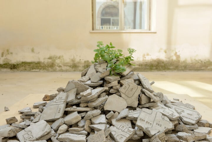 Nei Giardini delle sculture troviamo opere come Performance di una pianta, 2013-15, di Andrea Francolino (Bari, 1979) un cumulo di macerie, costituito dai frammenti di opere distrutte e accantonate dall’artista da cui è nata spontaneamente una pianta, dimostrando come anche dalla crepa e dalla maceria possano nascere la vita e la creatività. O ancora la pila di feltri piegati e accatastati di Corinna Gosmaro (Savigliano, 1987), parte della serie Baggages, 2016, con cui l’artista riflette sull’ospitalità che non sempre è facile da gestire.