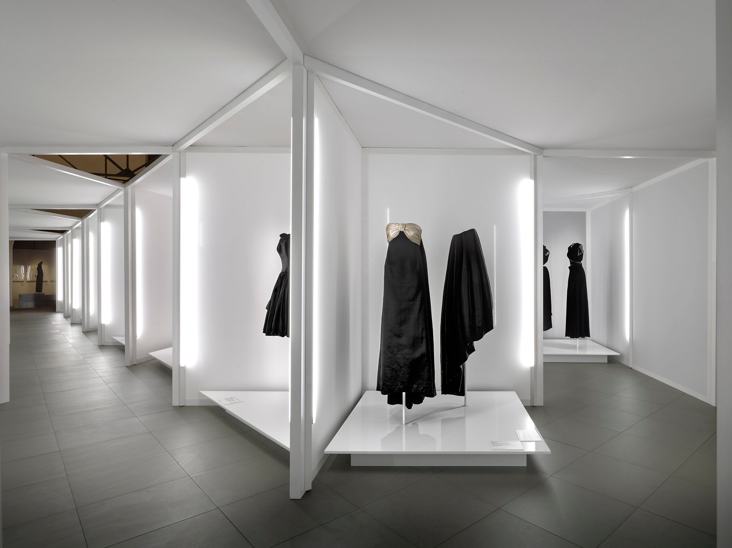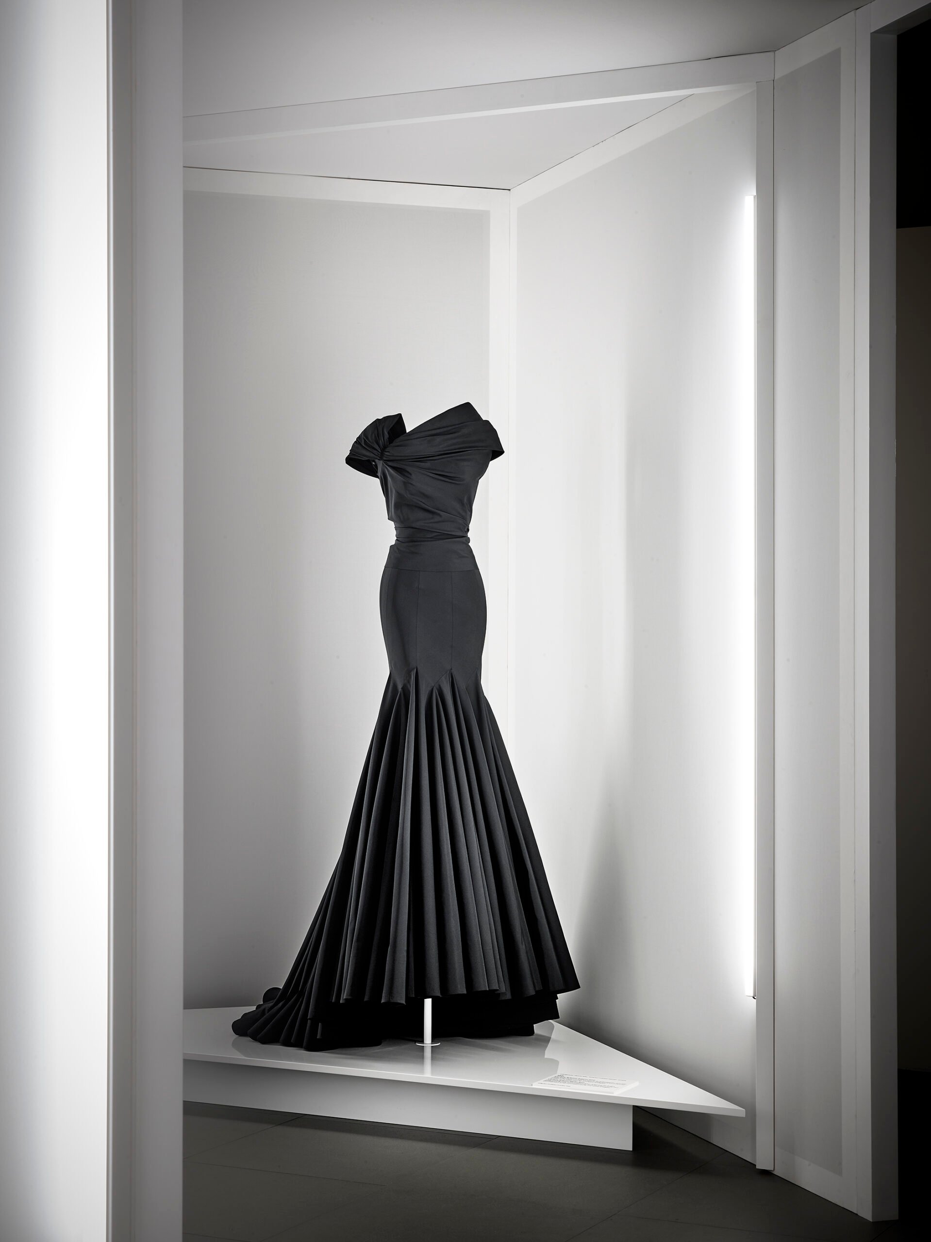 Alaïa / Balenciaga. Scultori della forma nasce nel 2020 all’interno della Fondazione Azzedine Alaïa, a Parigi. Il progetto prende vita dopo un lungo lavoro di ricerca e riflessione sulle parole di Hubert de Givenchy che, dopo la scomparsa di Azzedine Alaïa (2017) e quella di Cristóbal Balenciaga (1972), aveva espresso alla Fondazione il desiderio di riunire simbolicamente i due maestri della couture, legati da una profonda affinità artistica e spirituale. In mostra venticinque creazioni di Balenciaga e altrettanti di Alaïa dialogano in un percorso scandito dal colore nero, protagonista assoluto. Per Balenciaga, esso rappresentava la quintessenza della sobrietà e dell’eleganza, un segno di forza e misura che conferiva maestosità tanto agli abiti da giorno quanto a quelli da sera. Per Alaïa, invece, era una dichiarazione di stile: una tonalità assoluta che sublimava la sensualità del corpo femminile attraverso tagli millimetrici e tessuti tecnici — pelle, jersey, maglia — talvolta accostati a colori più vivi in raffinati contrasti di luce e materia.