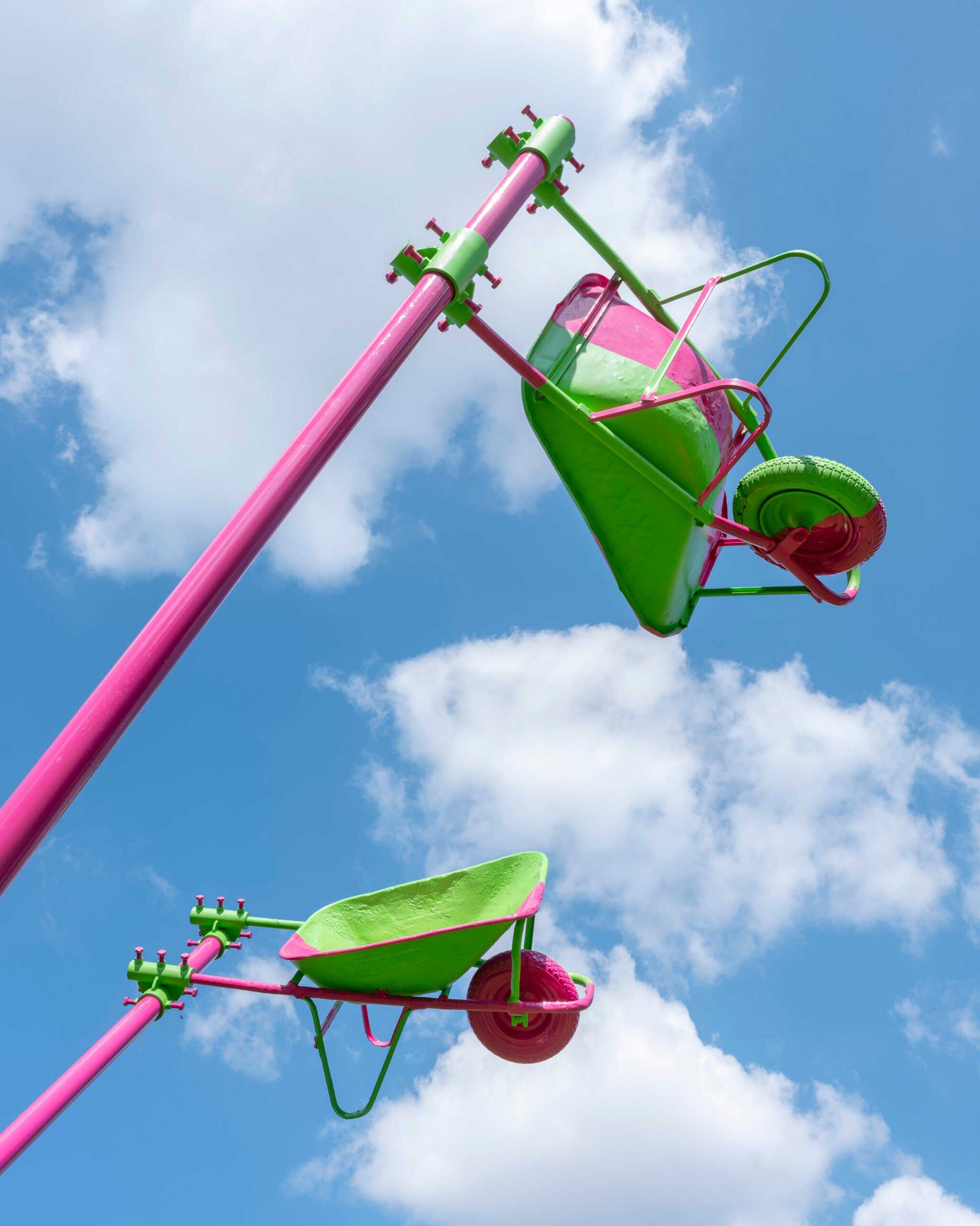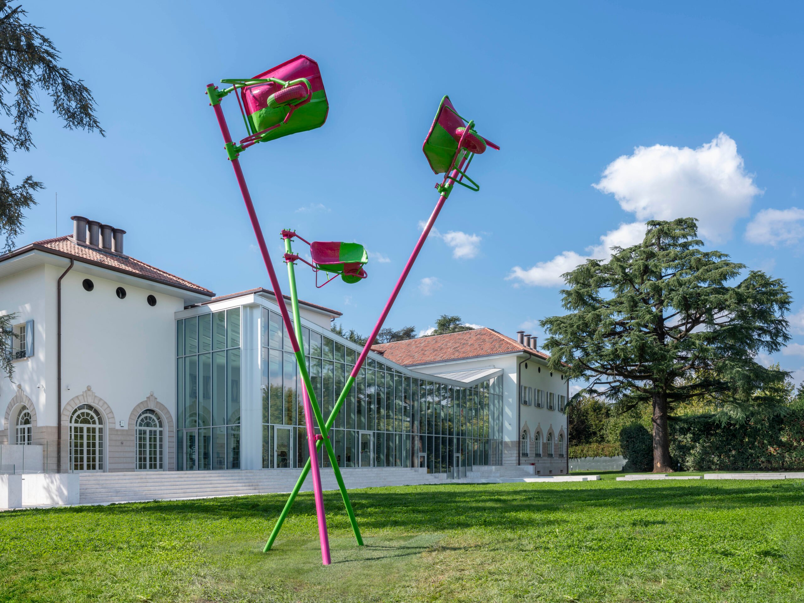 Si trova nel parco della fondazione Dalmine l’opera realizzata da Abraham Cruzvillegas (Città del Messico, 1968), un lavoro partecipato e collettivo, creato attraverso materiali di recupero. An unstable and precarious self-portrait munching some traditional Fritos…, titolo dell’installazione, la dice lunga sulla natura dell’opera in cui a partire dalla storia, convivono politica, attivismo e ironia. Tre carriole come insolite bandiere, svettano su pali, catalizzando con i loro colori accesi un’attenzione che è divenuta massima all’opening, quando il musicista Dudù Kouate ha attivato l’opera suonandola.