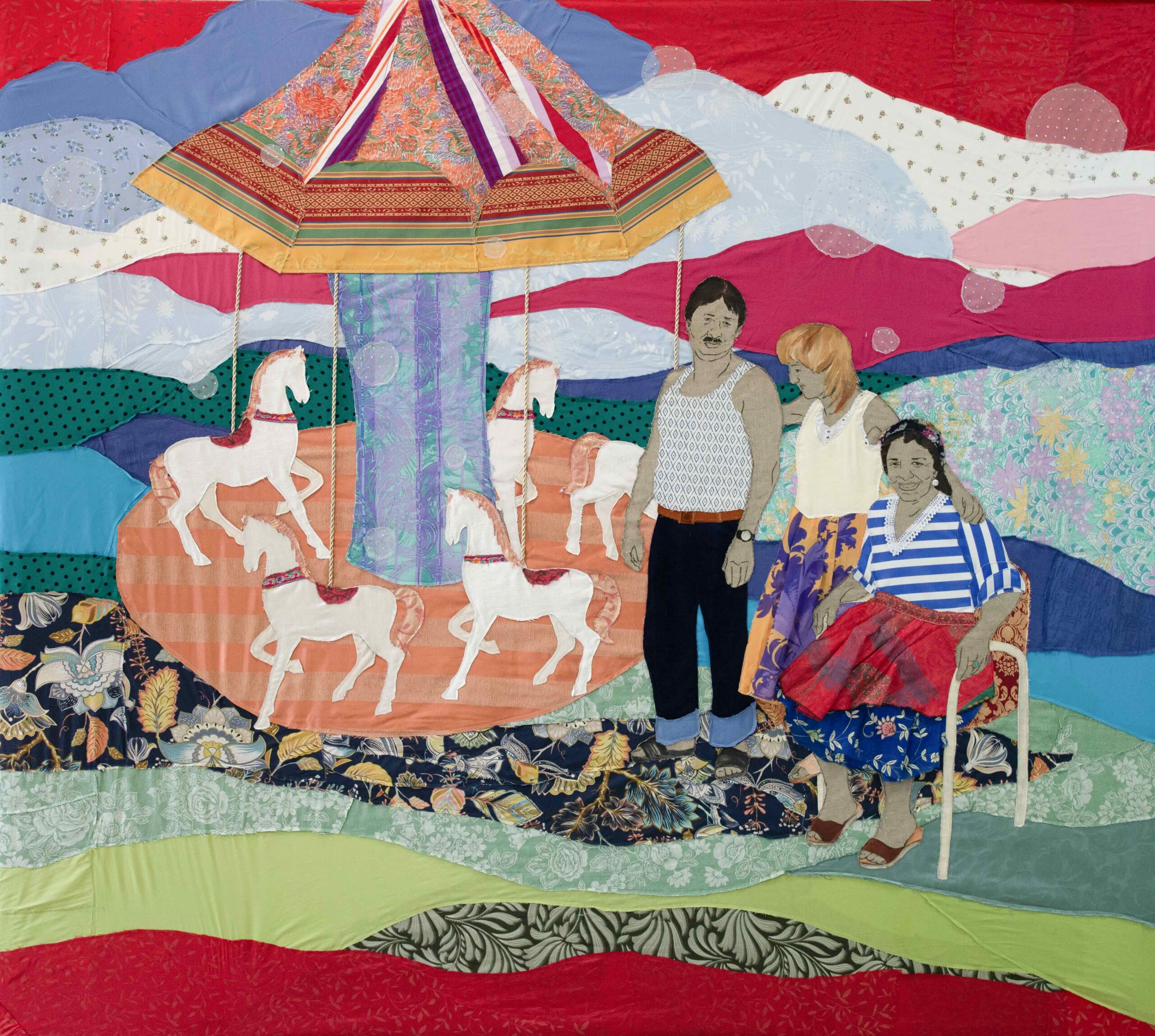 Al centro dello spazio, una giostra a seggiolini diventa una scultura della memoria. Ogni lato ospita un ritratto tessile di una famiglia sinta di Reggio Emilia, composto con abiti donati, frammenti di stoffe e materiali raccolti da mercatini o case private. La parte superiore racconta, attraverso testi d’archivio, la presenza storica dei Rom e Sinti in Emilia-Romagna, intrecciando cronache, poesie e testimonianze a partire dal 1422. Attorno, un grande quadro tessile e cavalli in legno fanno riferimento alla tradizione dei giostrai, mestiere tramandato di generazione in generazione, e diventano simboli di viaggio. Nella rotazione della giostra si riflette il tempo che ritorna, la vita che scorre, la condizione nomade come destino e resistenza.