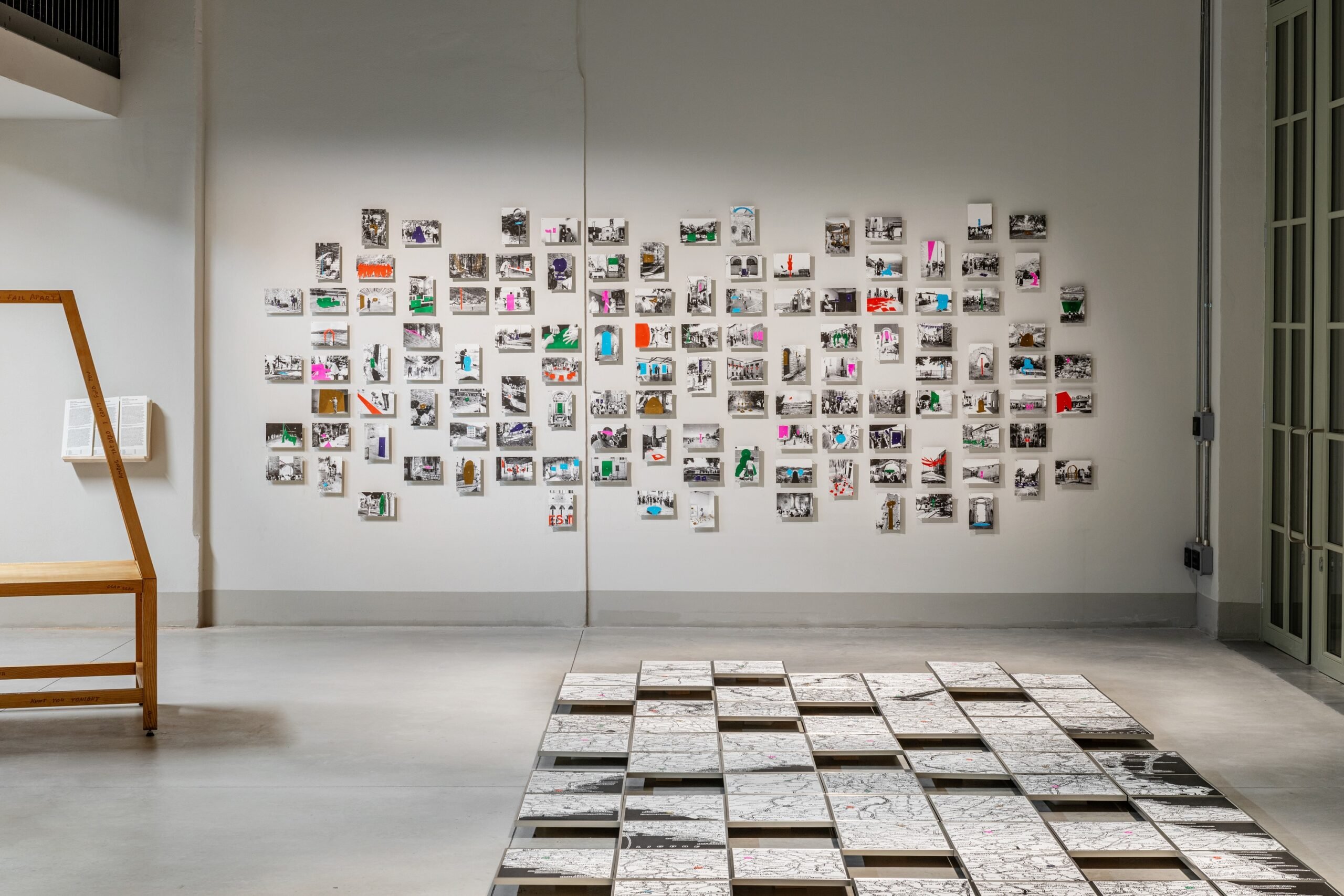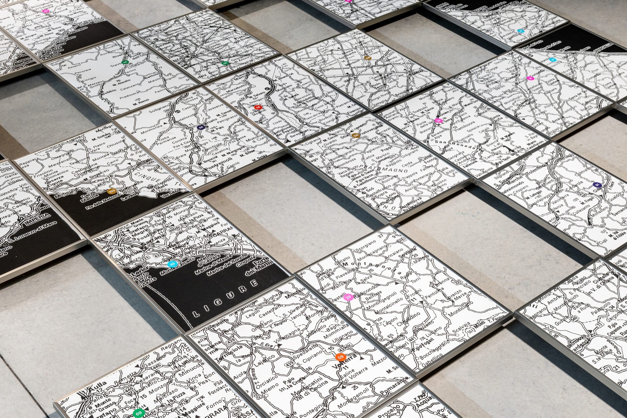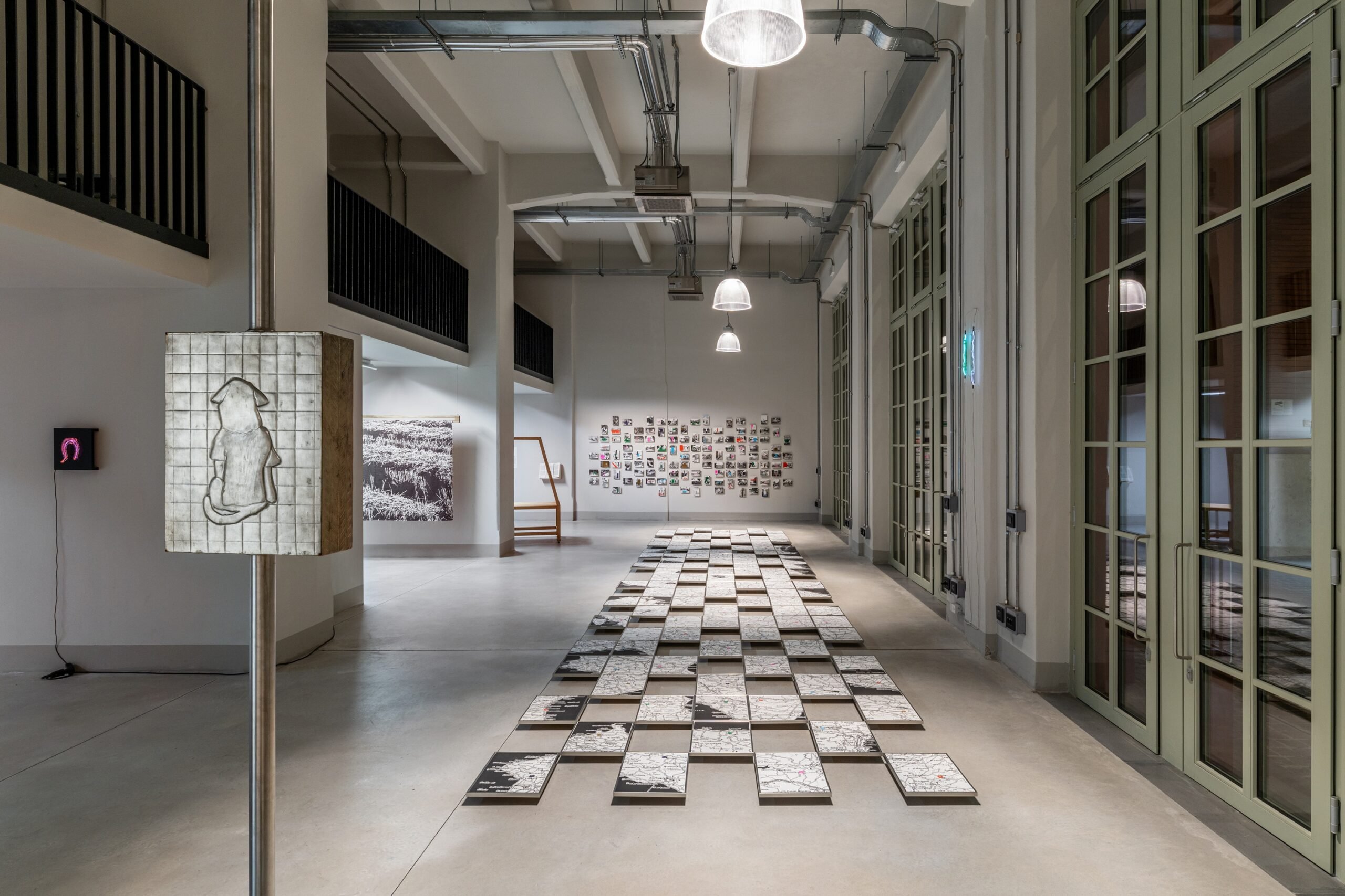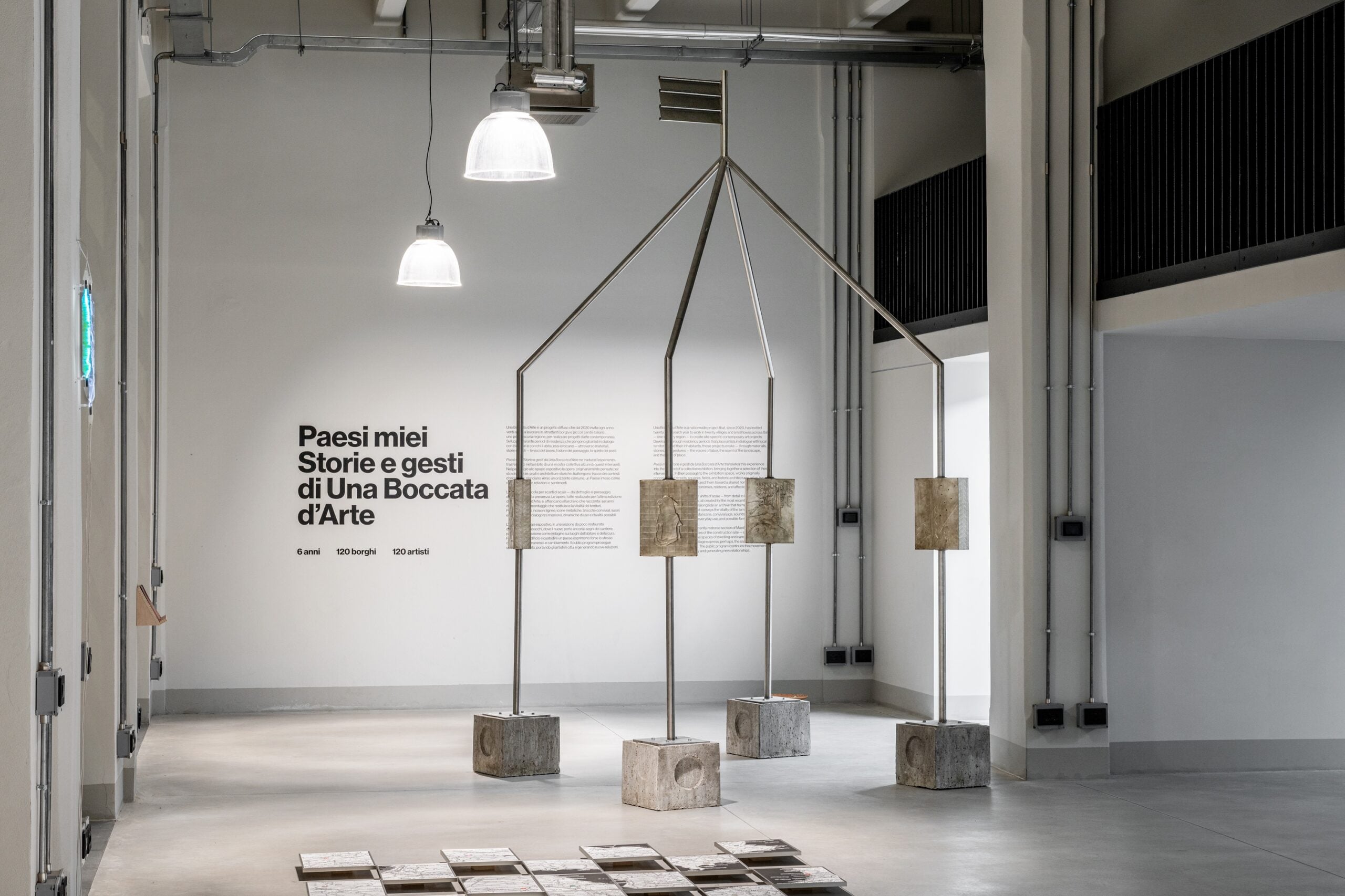 Uno dei momenti più interessanti della mostra è senza dubbio l’Atlas. Archive 2020-2025 dell’Atelier Tatanka, che restituisce la complessità e la capillarità con cui Una boccata d’arte si è diffuso nei borghi sconosciuti del territorio italiano. L’installazione, costituita da 120 stampe cartografiche e 120 stampe fotografiche – che riportano rispettivamente i luoghi in cui le opere sono nate e le immagini dei lavori ultimati – si sviluppa su due assi: orizzontale (a terra) e verticale (a parete) e, come un atlante, un archivio, rimane aperto alla possibilità di comprendere nuovi materiali provenienti dalle prossime edizioni del progetto. Apertura che auspica una maggiore partecipazione all’interno dello spazio urbano, aprendo, attraverso cartografia, arte contemporanea e tradizione, una strada verso una concezione sociale unificatrice dell’arte.