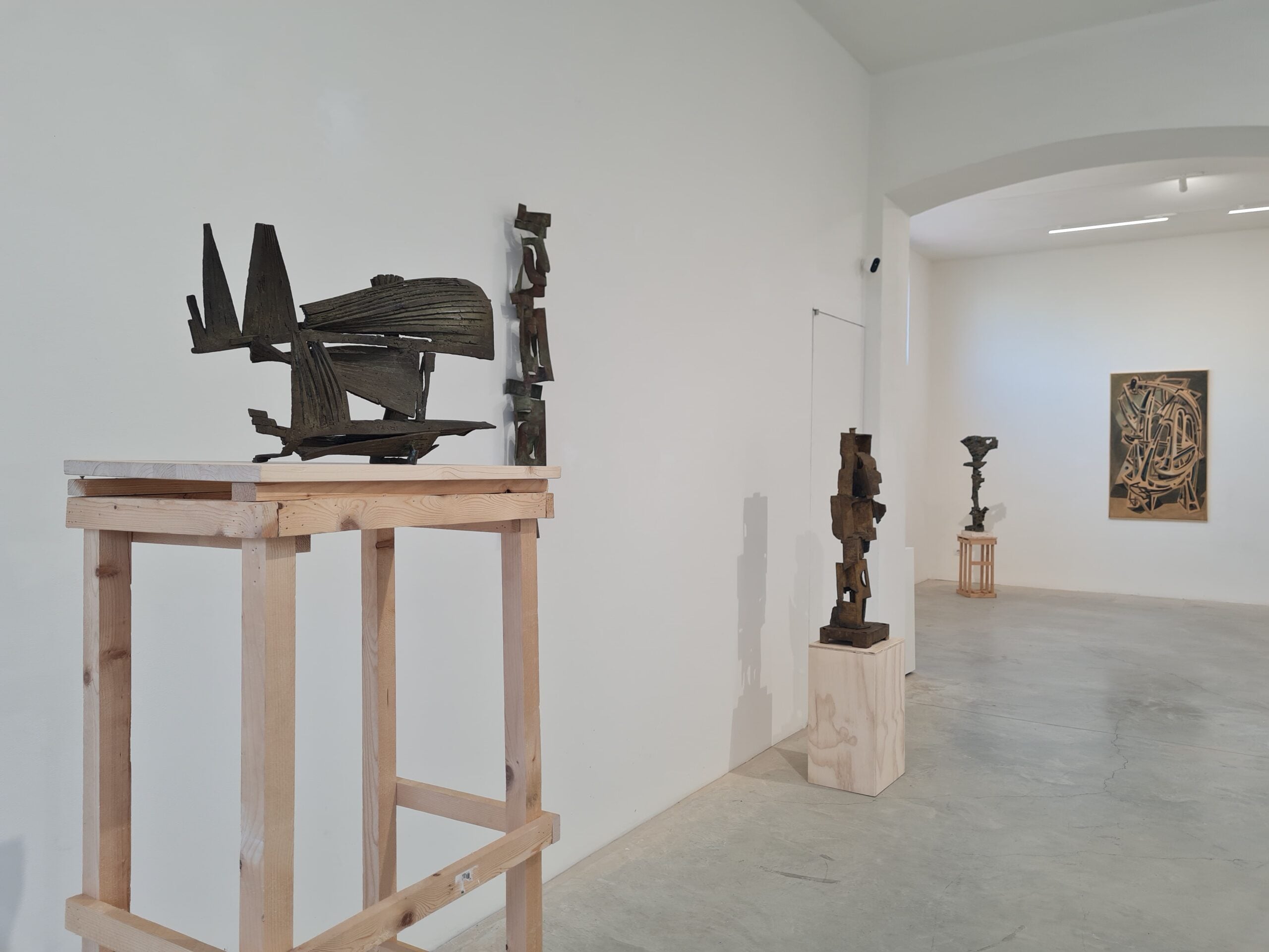 Non si parla solo di bronzo, ma anche di vari altri metalli – rame, ottone o acciaio – e legno intagliato e dipinto. La scelta di questi materiali duri e fisici chiama ancora in causa il contesto storico del secondo Novecento, associandosi tanto ai fatti bellici quanto alle correnti artistiche e alle sperimentazioni in corso. Se ci si sofferma sulle opere a parete di Basaldella, si traggono evidenti cenni alle astrazioni e alle scomposizioni cubiste, con intersezioni labirintiche di linee e forme. Trame continue, reticolati mostruosi: tessuti che sfidano la complessità dei materiali, con vibrazioni che li rendono vitali. Questo conferisce loro un impatto visivo forte ed emotivo che invita a riflettere sul linguaggio simbolico dell’artista.