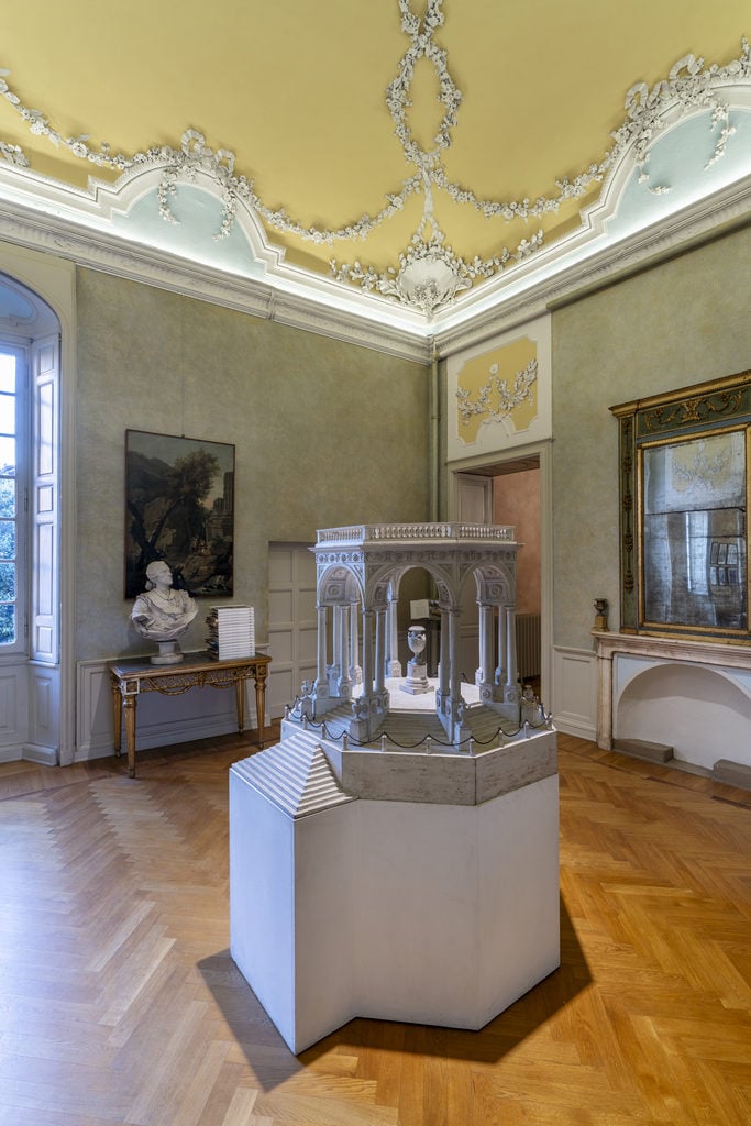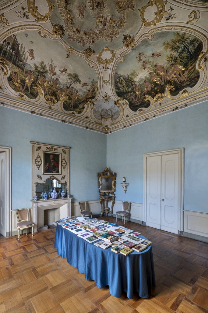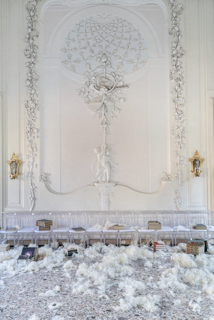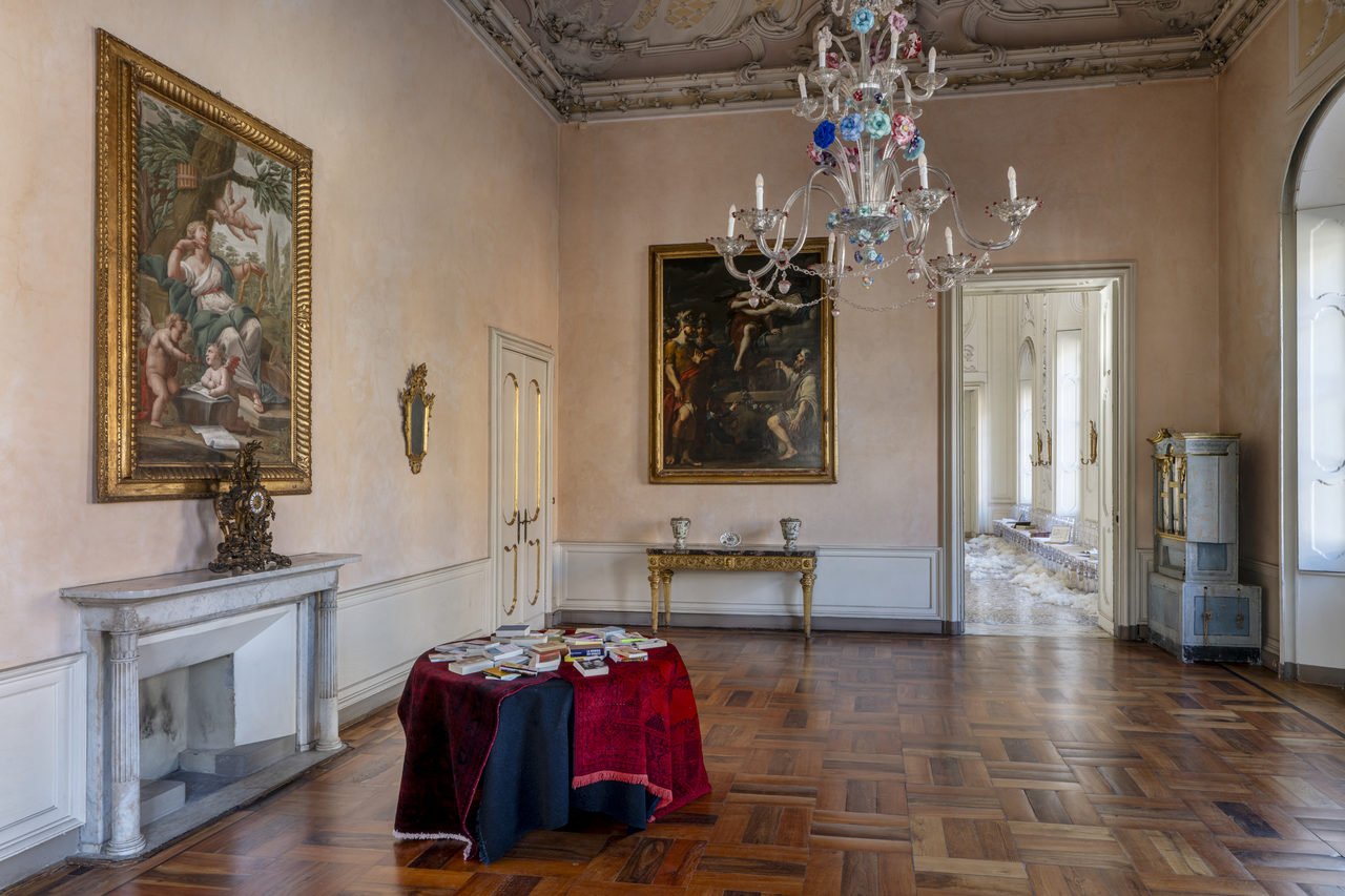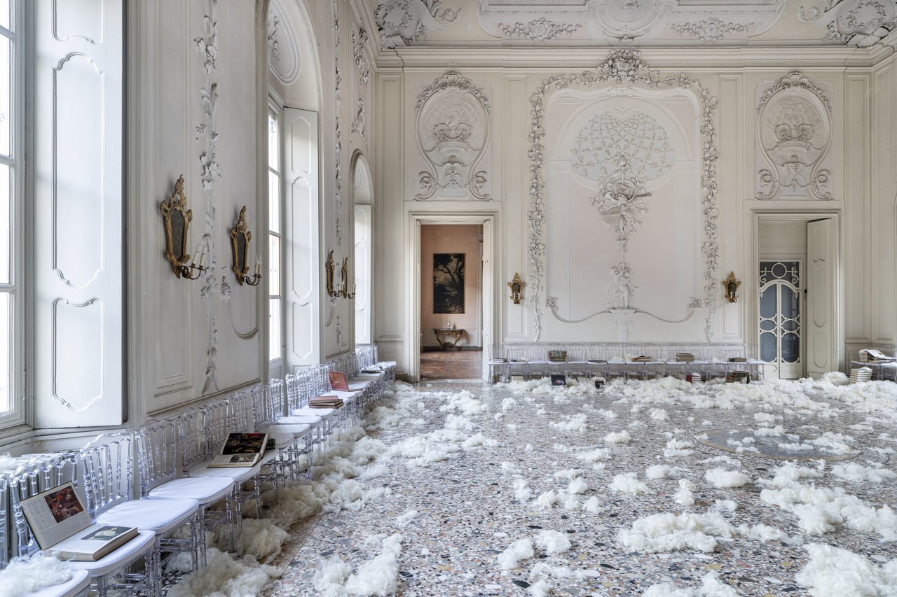 Il percorso della mostra si chiude con un’altra installazione di forte impatto visivo ed emotivo realizzata di recente dall’artista proprio pensando a Palazzo Marchi. Nella sala settecentesca delle danze è una nuova versione site-specific di Enciclopedia, opera che rientra tra i suoi lavori più iconici. Qui il libro viene pensato ed esposto come oggetto artistico e le enciclopedie di un tempo, oggetti che ormai appartengono al modernariato e da cui Arienti è sempre stato molto affascinato anche da bambino, dialogano con lo spazio stesso al punto, quasi, da mimetizzarsi. In un allestimento voluttuoso, dove il bianco della lana sul pavimento regna sovrano creando quasi un fiabesco effetto nuvola, ci si trova a camminare tra antico e moderno, nell’eterna sensazione di attraversare gli strati del tempo.