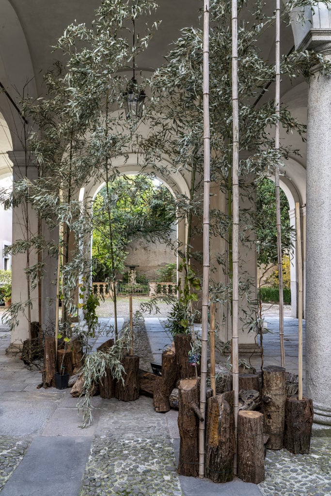 Nella mostra ad ogni stanza è dedicato un tipo di manipolazione del libro differente rispetto alle altre e nelle didascalie delle opere, oltre al nome e ai materiali, si legge, appunto, anche il tipo di lavorazione che l’artista ha applicato ai volumi. Non appena si entra nel cortile di Palazzo Marchi, si viene accolti da un’installazione inedita di Arienti: un Orto dei libri, il primo mai ideato e creato dall’artista. Un’opera viva dove volumi di vario tipo sono stati perforati dall’artista con un trapano a colonna e disposti dentro una serie di cassettine di legno ai piedi e ai lati di alberi di lampone, di alloro, di kiwi o di vite, in un groviglio fiabesco che nelle sue trame coinvolge anche tronchi di quercia, platano, vigna o bambù. Un’opera in continua trasformazione che dialoga con l’architettura splendida del Palazzo di Via Repubblica e che probabilmente l’artista riproporrà, rivisitata, anche in India, dove, gli è stata commissionata un’opera scultorea simile a questa. Nella seconda stanza del palazzo è esposto un elenco telefonico di Milano dove l’artista, pagina per pagina, ha cancellato con pittura murale parte delle informazioni. Un oggetto, l’elenco telefonico, che nelle nostre case non esiste più e che ci riporta in un passato non troppo lontano ma comunque perduto. Impossibile non riflettere, attraverso l’arte di Arienti, su come cambi il rapporto che abbiamo con le cose, tema centrale in tutta la sua poetica artistica.