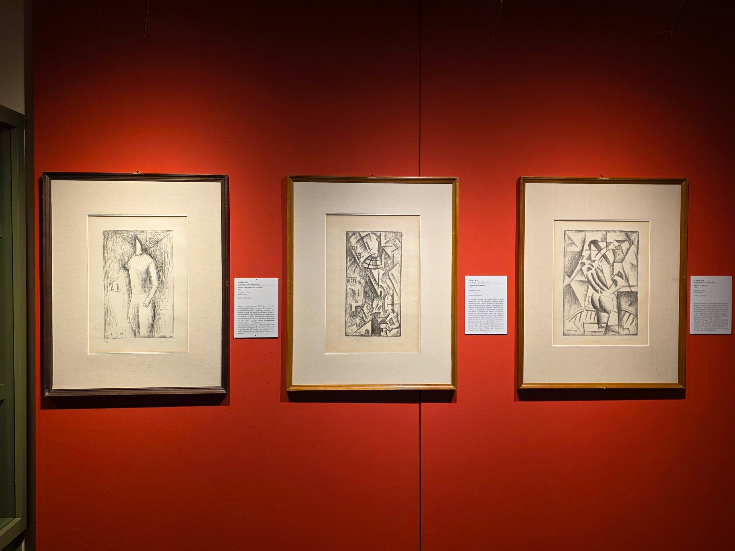 Dal 1949 l’artista ripensa alla sua pittura. Le sale conclusive sono dedicate alle litografie prodotte negli ultimi anni, caratterizzate da una rielaborazione nostalgica degli elementi prevalenti di Cubismo, Futurismo e Metafisica, come nella tavola White horse (1944). A questo periodo risalgono le cartelle Carrà 1912-1921 e i due album Carrà, dove le opere giovanili ritornano con toni soffusi. Abbandonato il Futurismo, Carrà raffigura un’umanità arcaica che riemerge da un passato lontano. Dopo l’esperienza della guerra la vita riprende a fatica; tutto ciò si riflette nelle sue opere dove manichini mutilati sono bloccati in azioni sospese, al centro di piazze o stanze stranianti, come Solitudine (1949). Sono incisioni a colori, caratterizzate da velature tenui che sostituiscono alla velocità futurista il non tempo in cui infanzia e classicità si mescolano, come ne L’ovale delle apparizioni (1952). Le ultime tavole, per lo più paesaggi e nature morte, sono pervase di malinconia, ma cariche di energia creativa. L’ultima incisione realizzata dall’artista, epilogo alla mostra, è Il cancello (1964). Pur imponendosi come limite e argine di ferro impenetrabile allo sguardo dell’osservatore, l’immagine funge da metafora, una forma di congedo dalla vita e dal visitatore che saluta la mostra, volgendo un ultimo sguardo su un percorso intimo ed intenso.