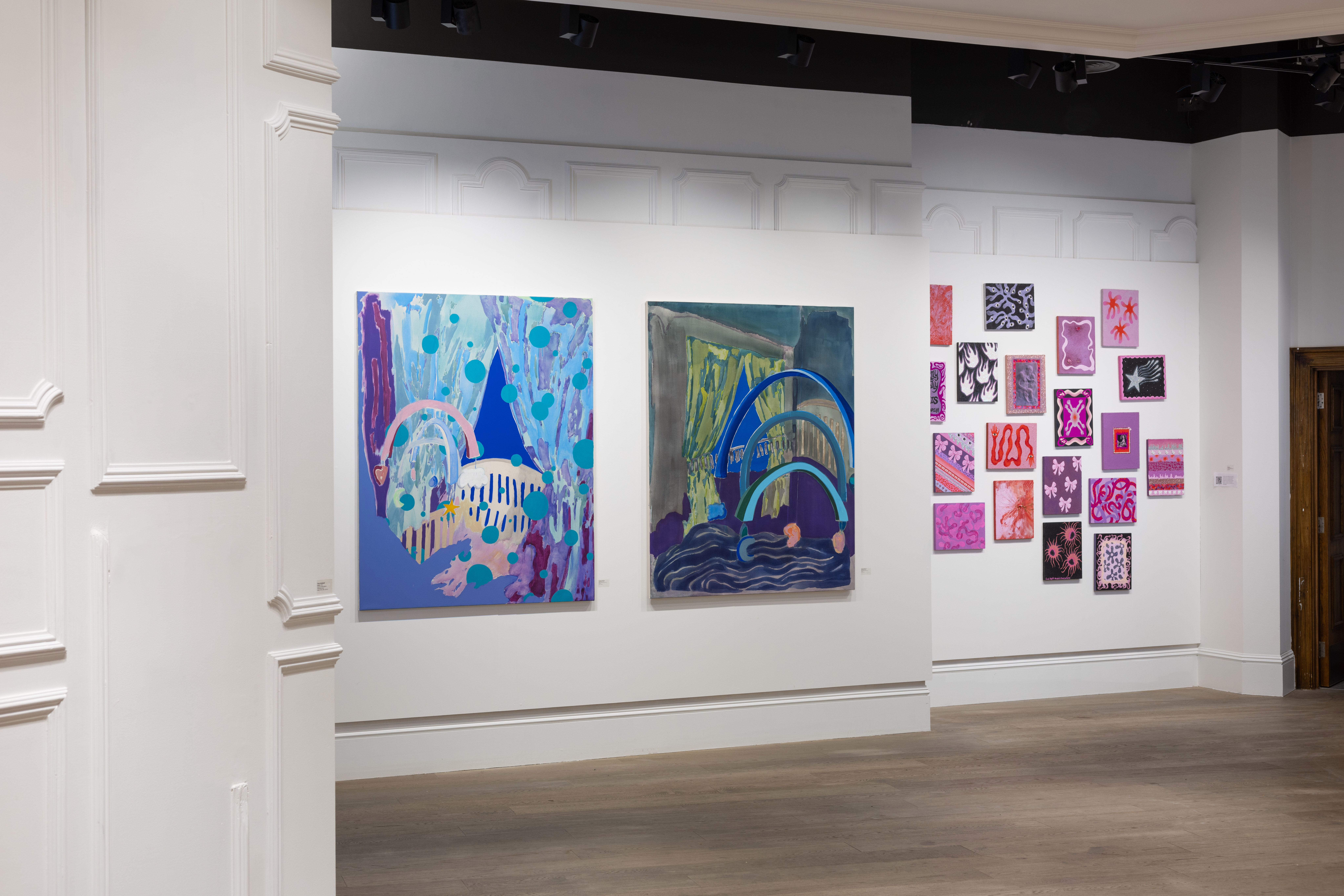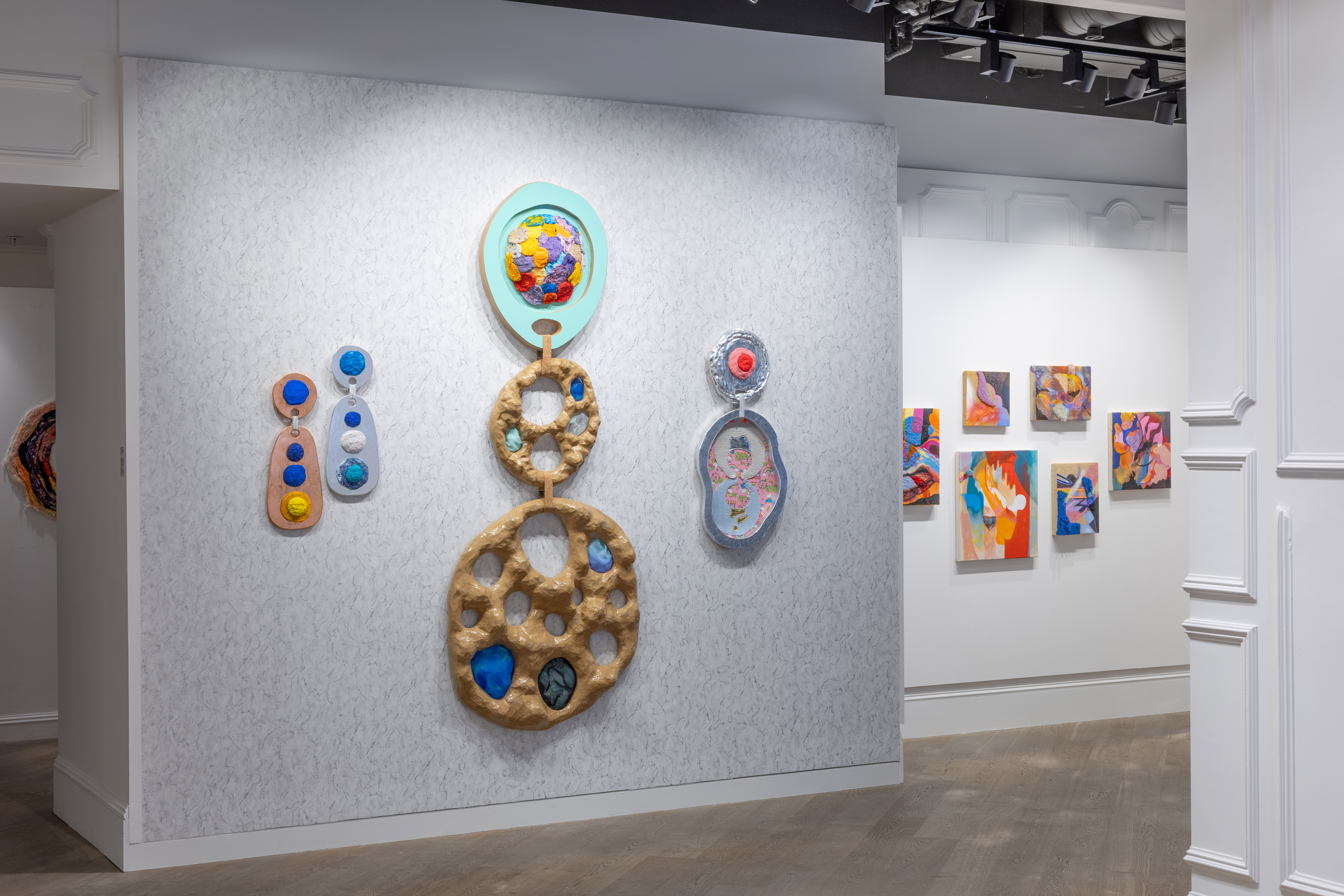 Lisa-Marie Harris propone sculture in pelle cucite a mano come Tensile e Lip che esplorano il vincolo corporeo e il lavoro femminile. Queste astrazioni materiche incarnano la tensione, il controllo e la pressione silenziosa del ruolo materno. Ludovica Gioscia presenta Tryptic of Love, orecchini giganti in cartapesta ispirati alla fertilità, alla PMA e alla vita postpartum. Tra motivi corporei e kitsch nostalgico, celebrano vulnerabilità e forza materna. I Follow Rivers di Michal Raz è una serie di pannelli misti che cattura l’intensità della maternità durante i primi mesi dopo il parto. Tra chakra, fiabe e simboli archetipici, l’artista traccia un viaggio fatto di euforia, stanchezza e trasformazione interiore. L’opera di Or Lapid ruota attorno al desiderio di trattenere l’infanzia, un impulso tenero e malinconico a preservare l’innocenza nel passare del tempo. Brave New World di Qian Qian è una serie partecipativa che ritrae storie di nascita sotto forma di embrioni. The Search è un’animazione pittorica che intreccia riproduzione, lutto e maternità speculativa attraverso un linguaggio tra scienza e mito. Gli arazzi in feltro di Sophie Goodchild, infine, esplorano caos, contenimento e ciclicità. Ispirati a spirali naturali e processi geologici, le opere nascono da gesti tattili e intuitivi che raccontano la maternità attraverso materia e simbolo.
